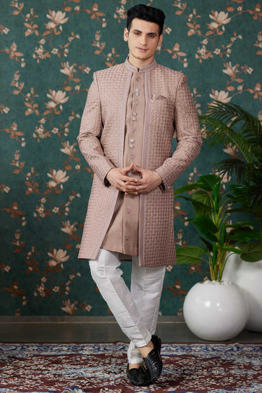 Art Silk Fabric Readymade 3 Piece Indo Western In Artistic Chikoo Color