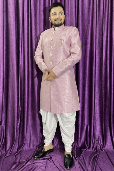 Pink Color Silk Fabric Wedding Wear Readymade Peshawari Style Indo Western For Men