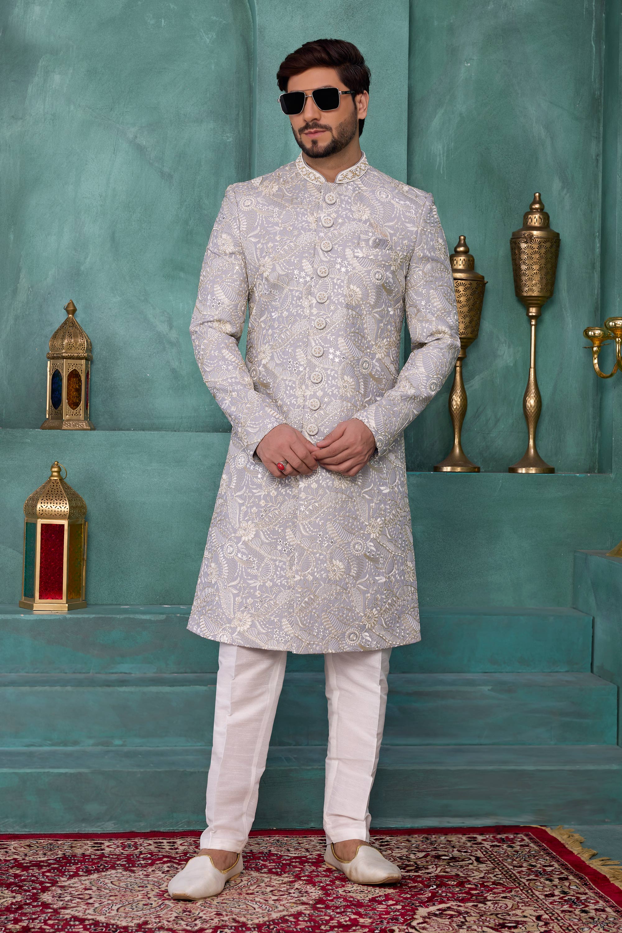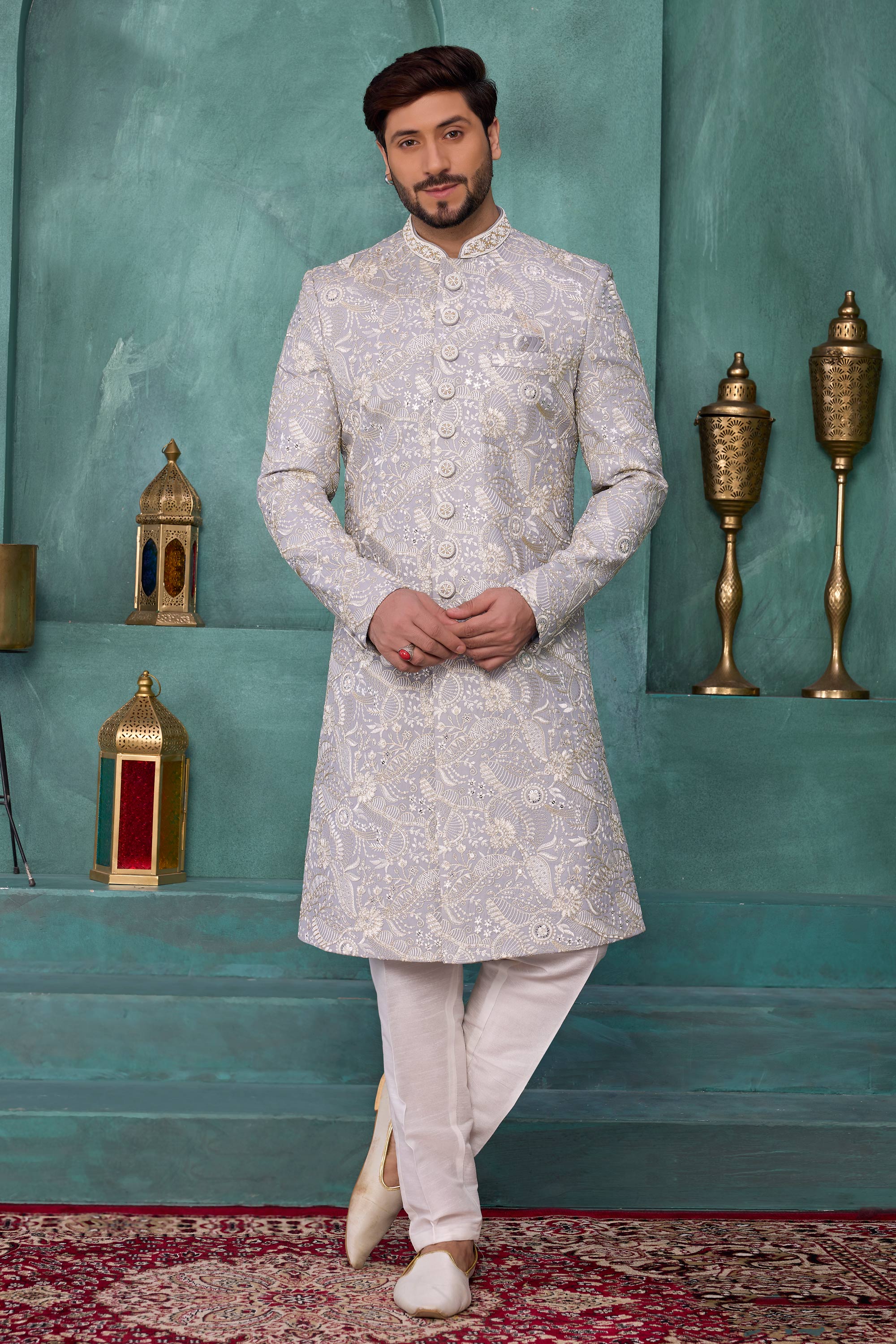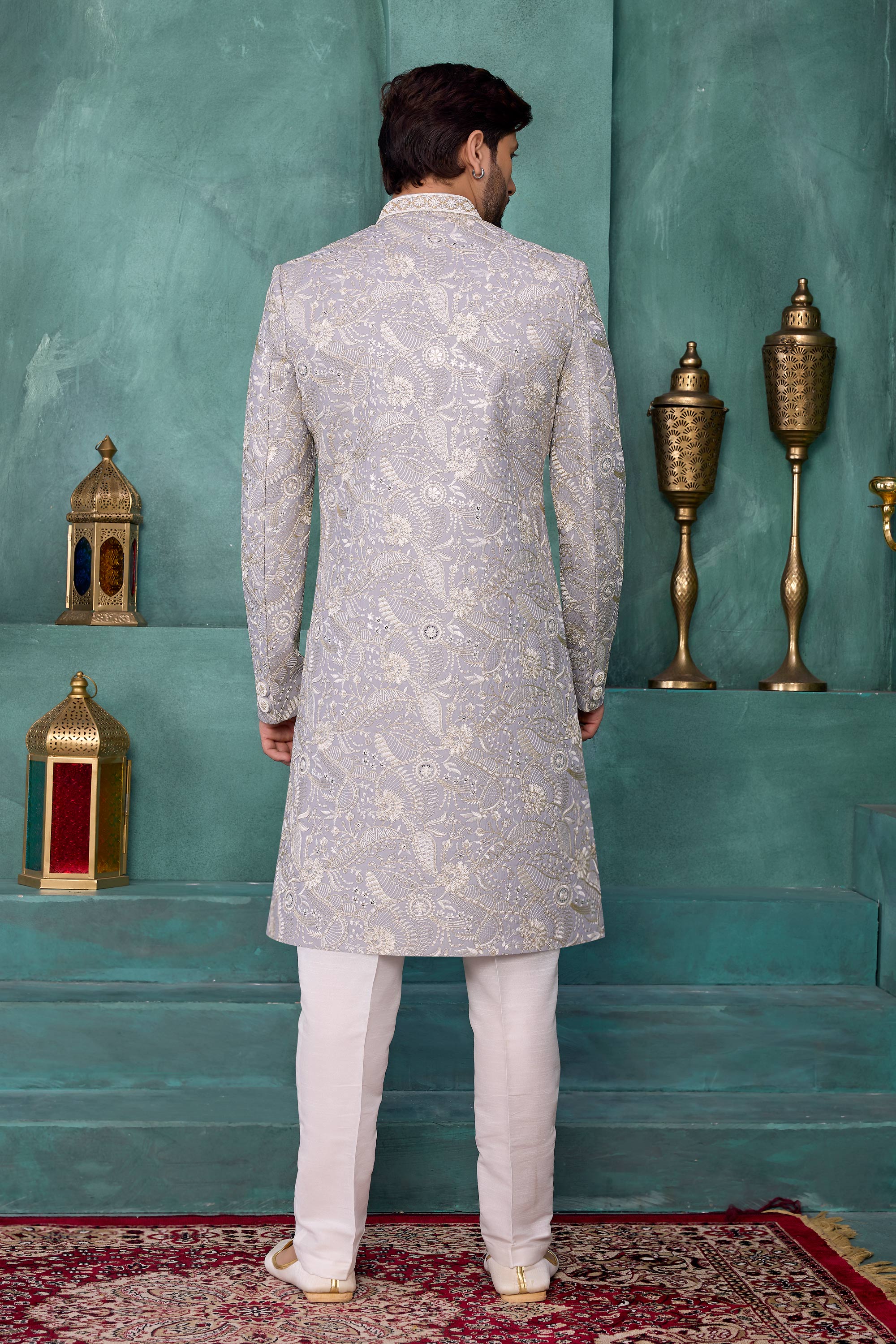 Art Silk Fabric Grey Wedding Wear Readymade Sherwani For Men