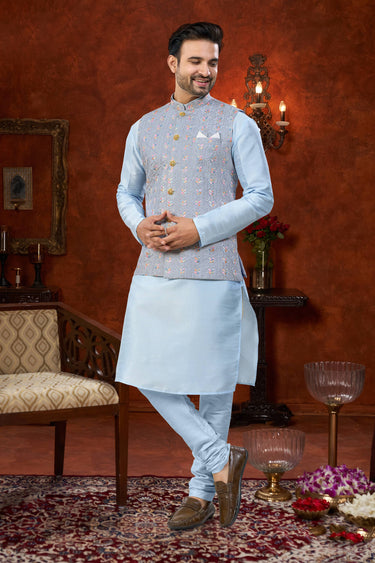 Cyan Wedding Wear Art Silk Readymade Kurta Pyjama For Men