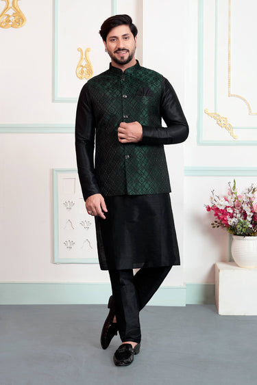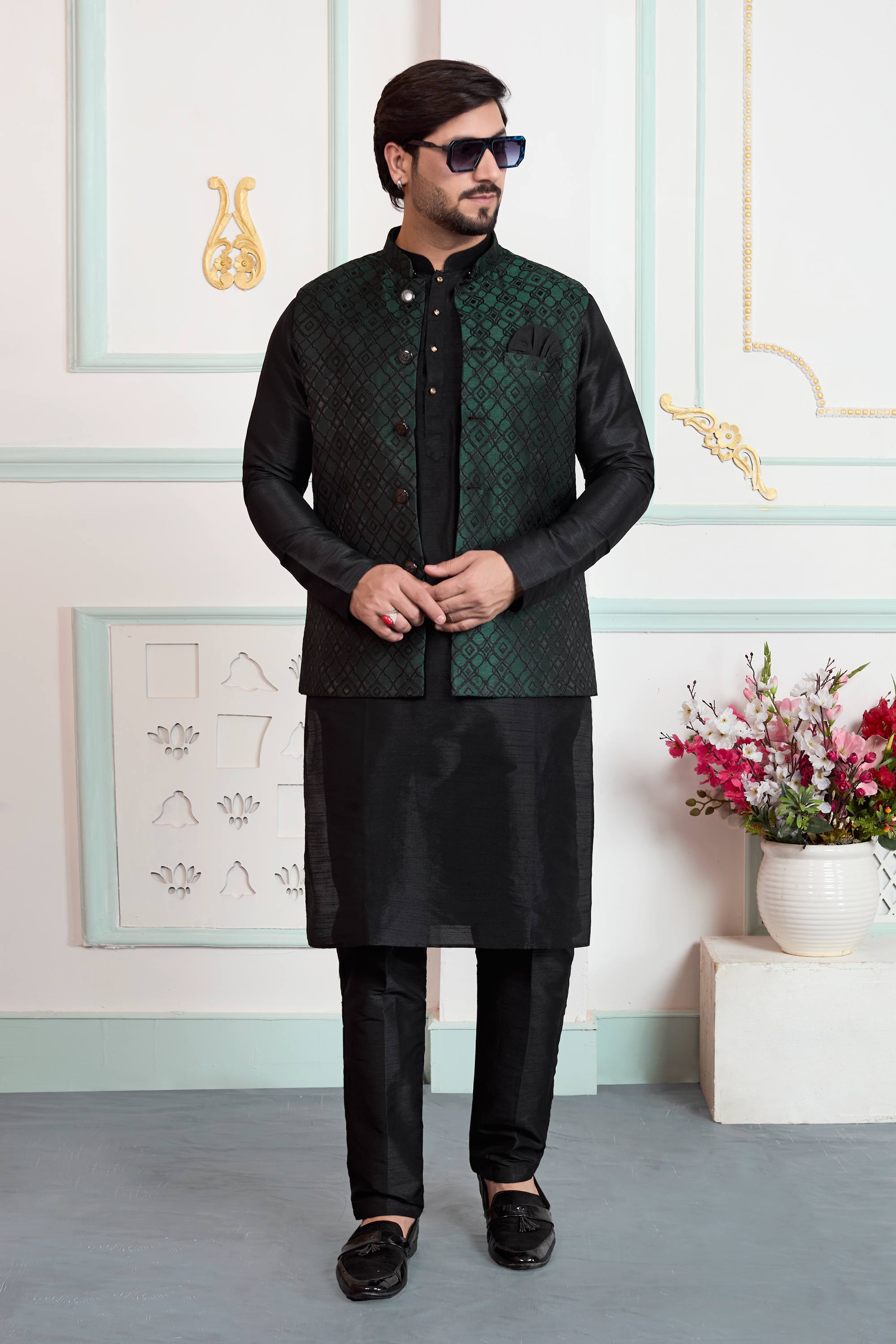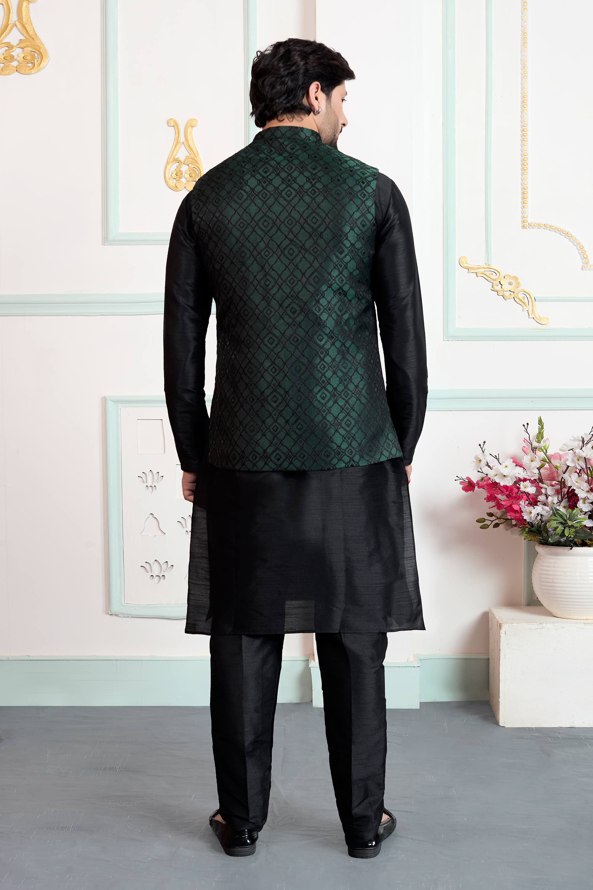 Dark Green Jacquard Fabric Men Readymade Kurta And Aligadhi Pant With Jacket For Wedding Wear