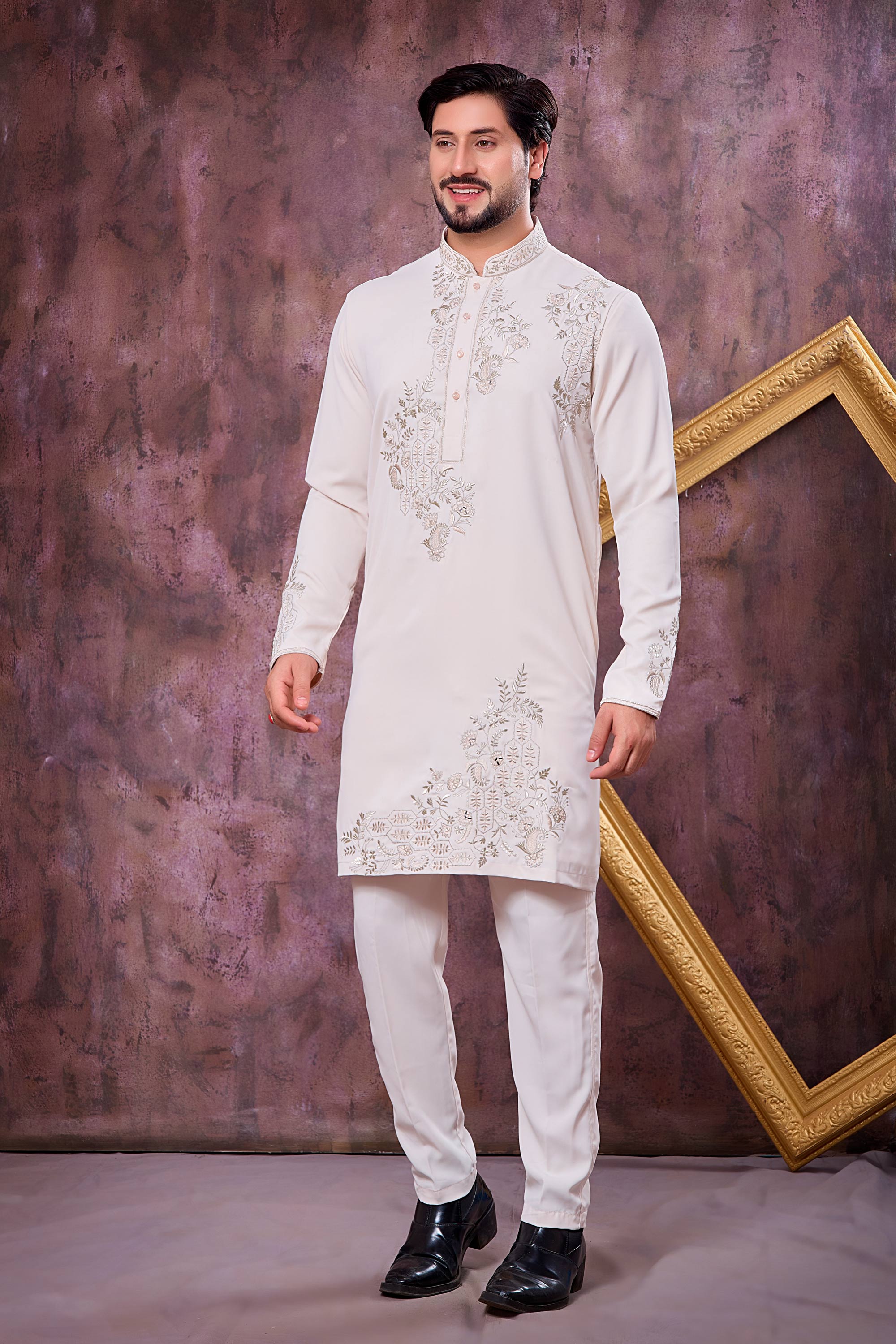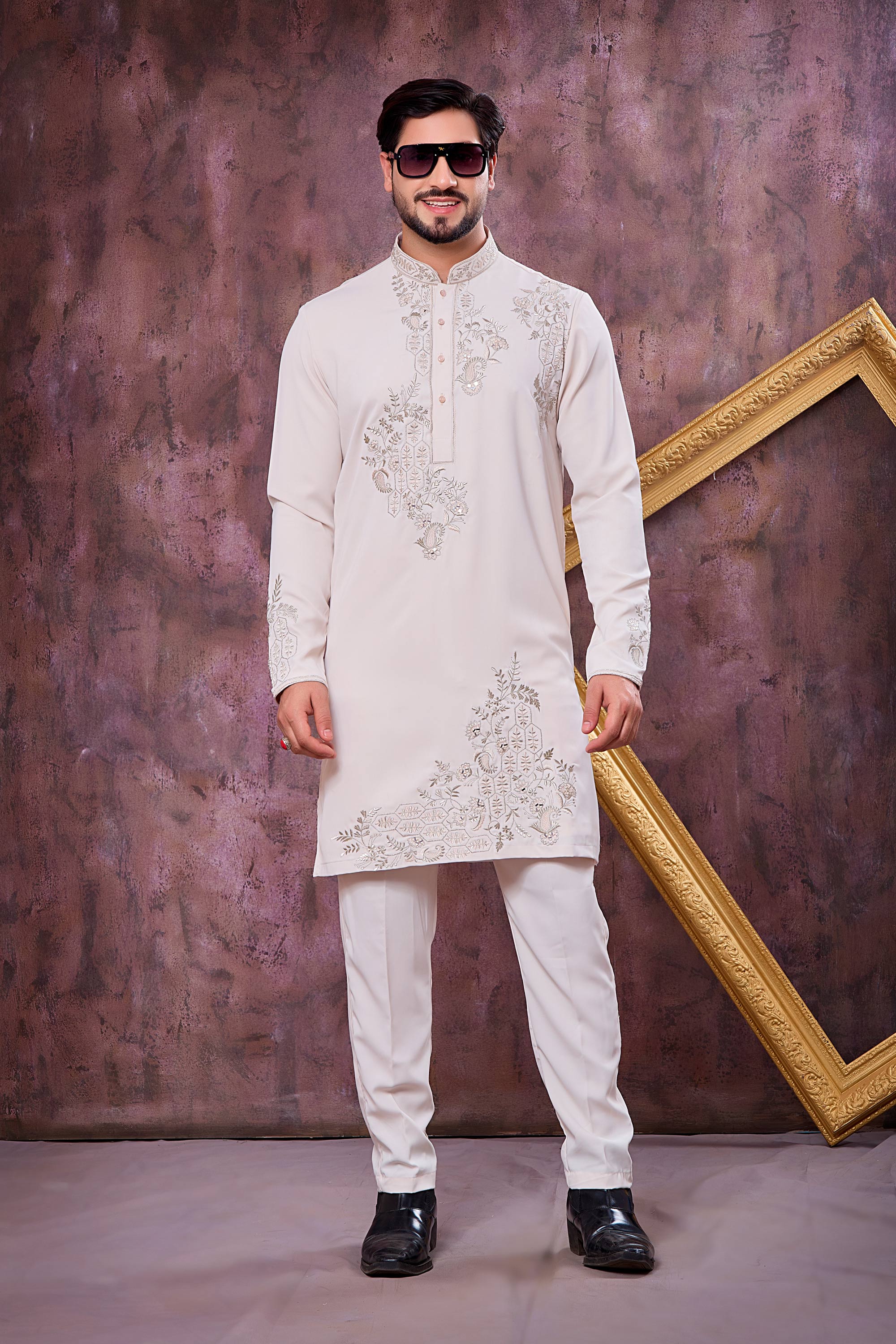 Fancy Fabric Embroidered Cream Readymade Kurta With Aligadhi Pant For Men