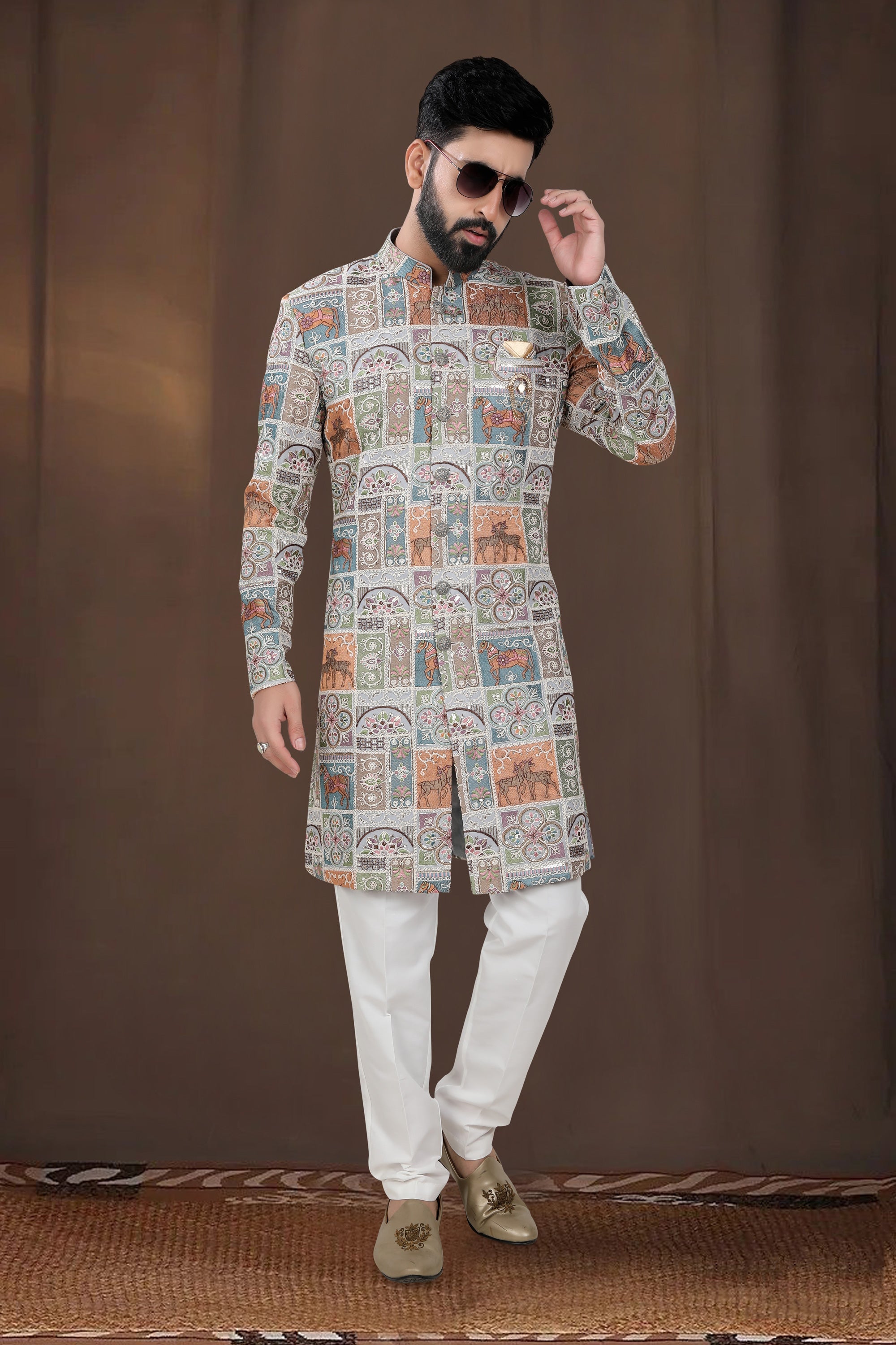 Georgette Light Blue Wedding Wear Designer Readymade Indo Western For Men