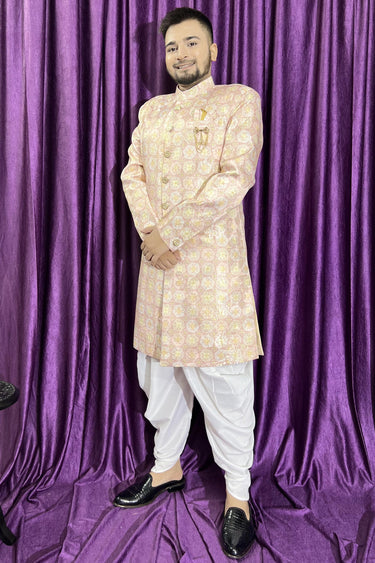 Jacquard Peach Magnificent Readymade Men Peshawari Style Indo Western For Wedding Wear