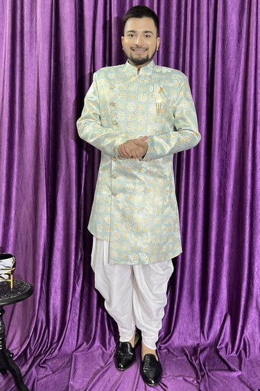 Light Blue Jacquard Fabric Magnificent Readymade Men Peshawari Style Indo Western For Wedding Wear