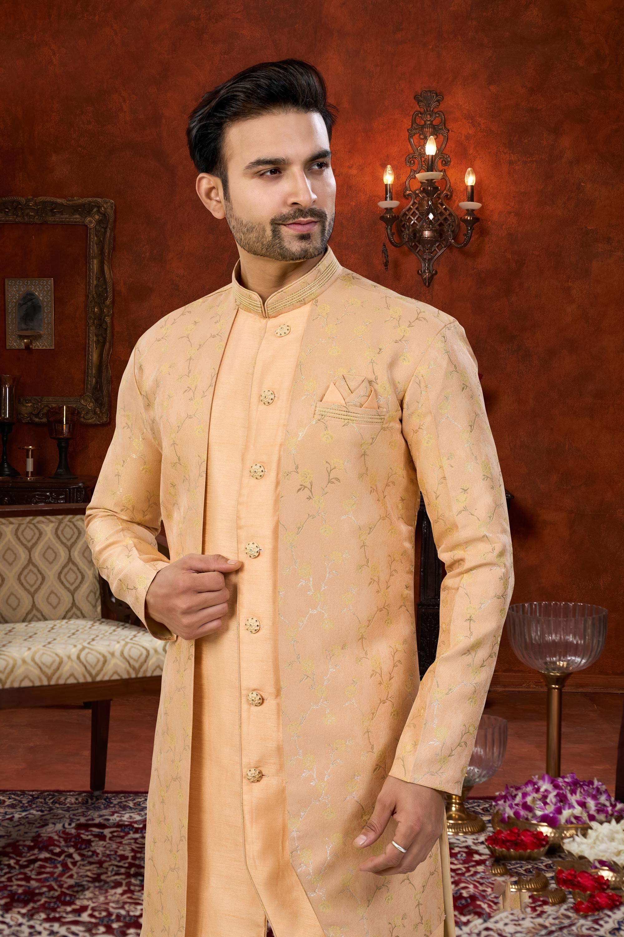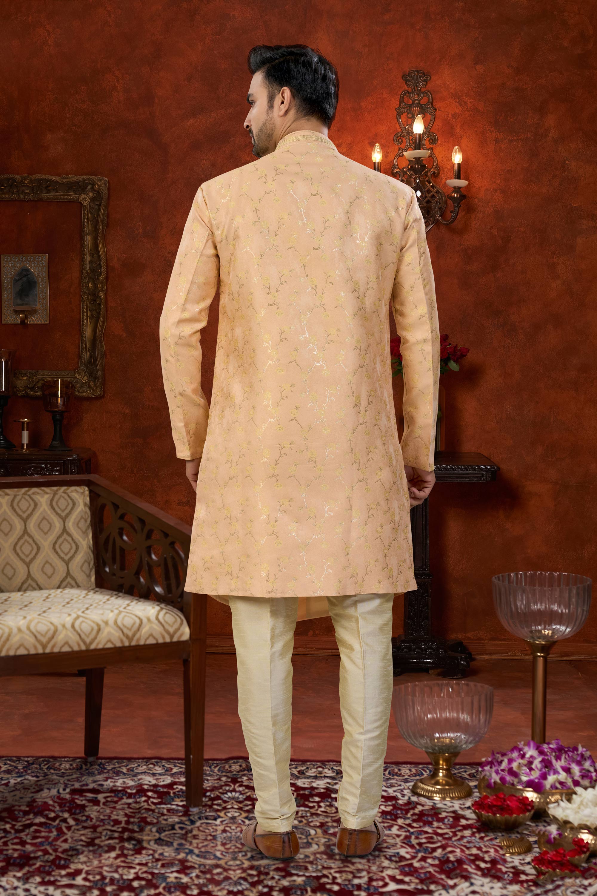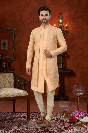 Peach Wedding Wear Banarasi Silk Fabric Readymade Indo Western For Men
