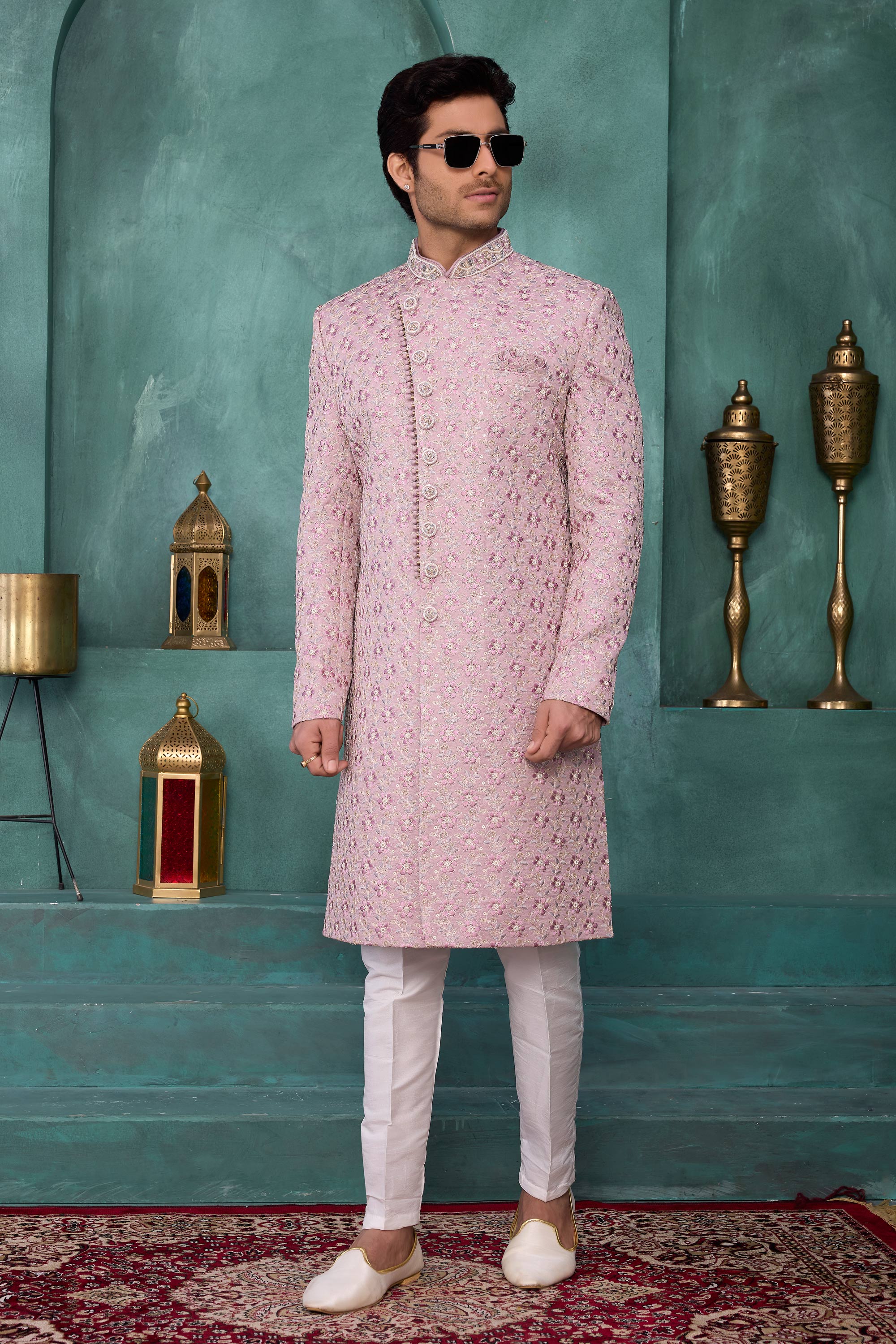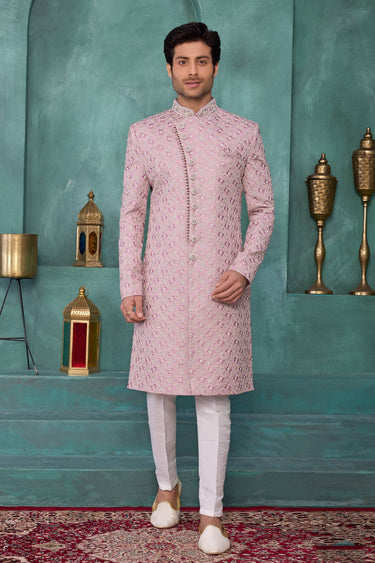 Pink Wedding Wear Art Silk Fabric Readymade Sherwani For Men