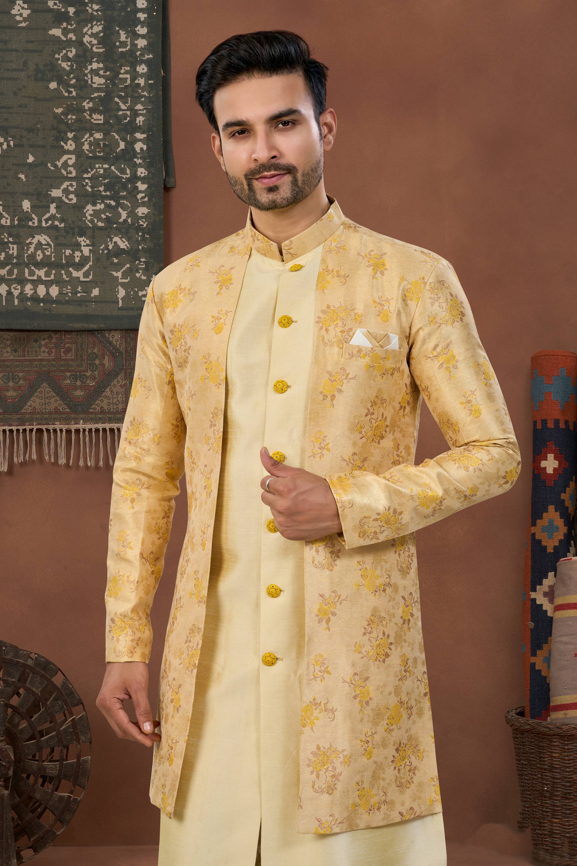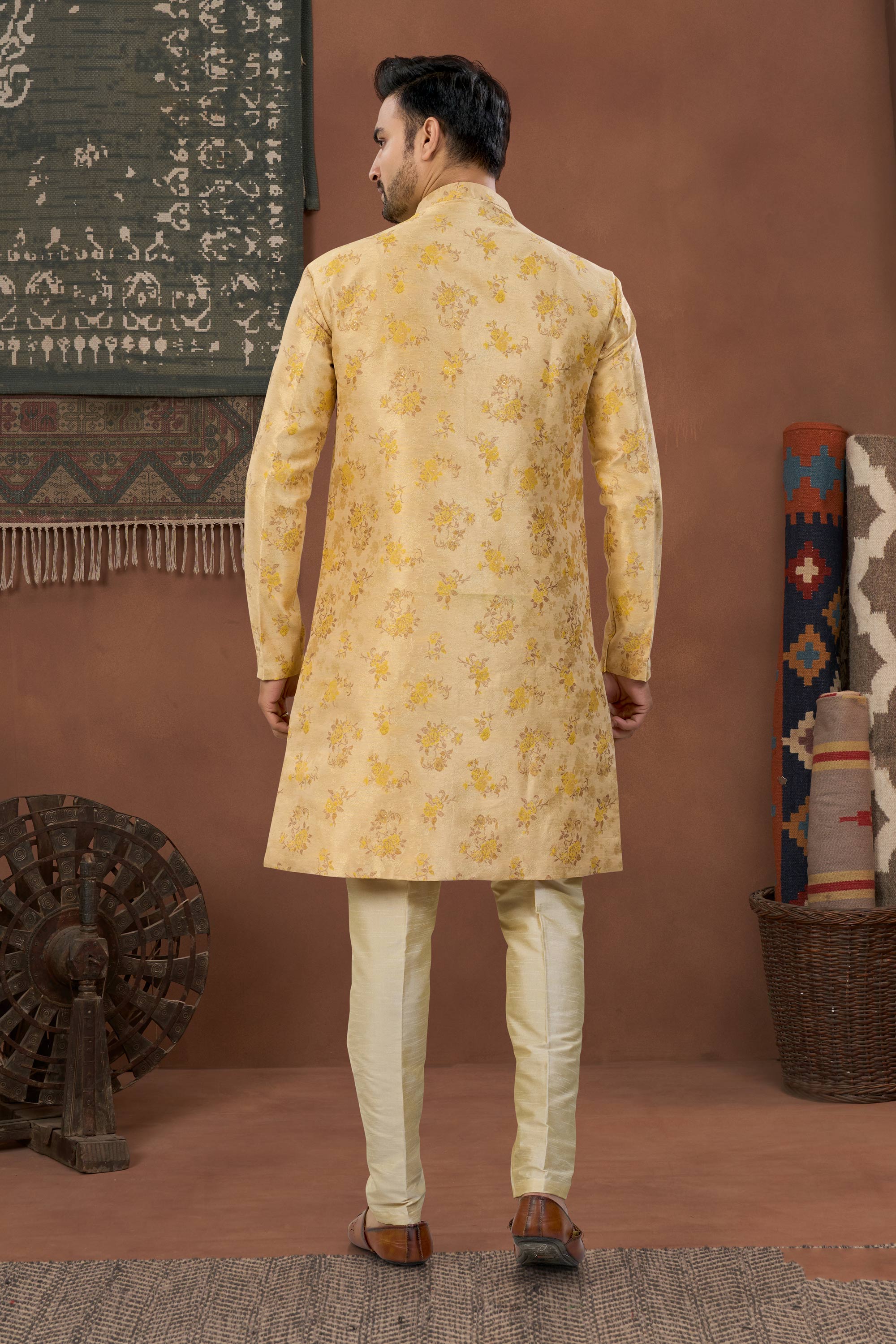 Yellow Wedding Wear Banarasi Silk Fabric Readymade Indo Western For Men