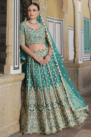 Net Sangeet Wear Lehenga Choli In Sea Green Color