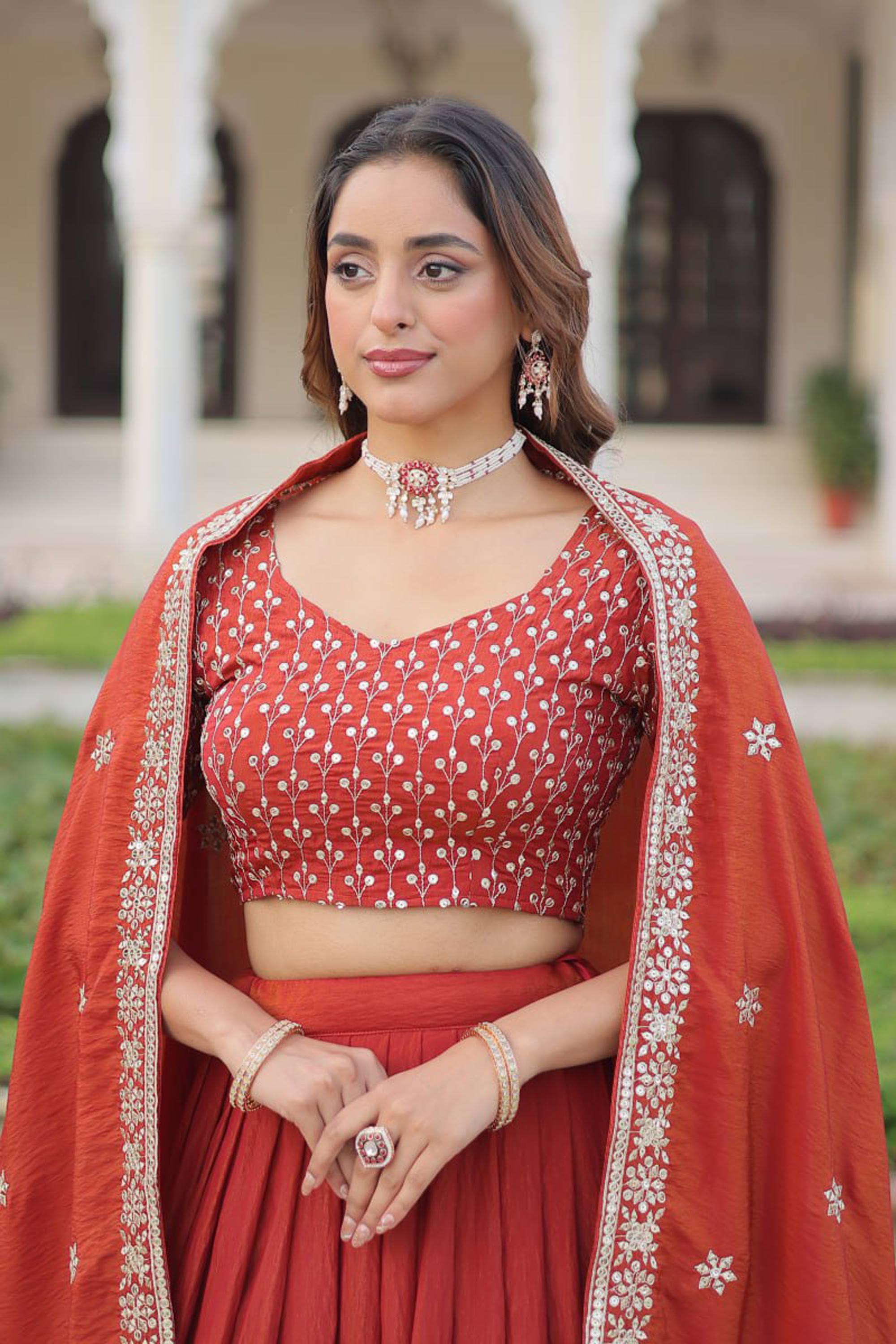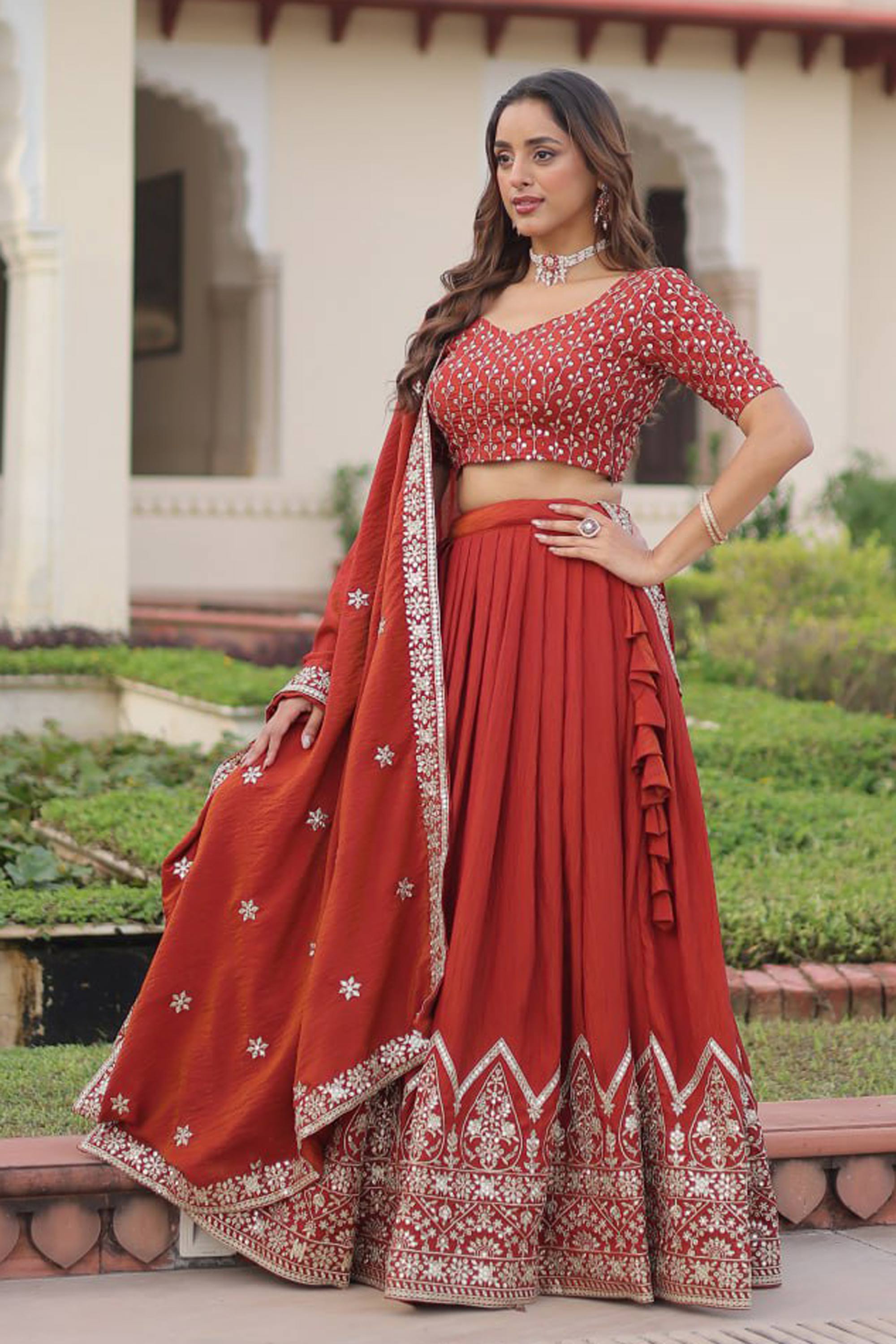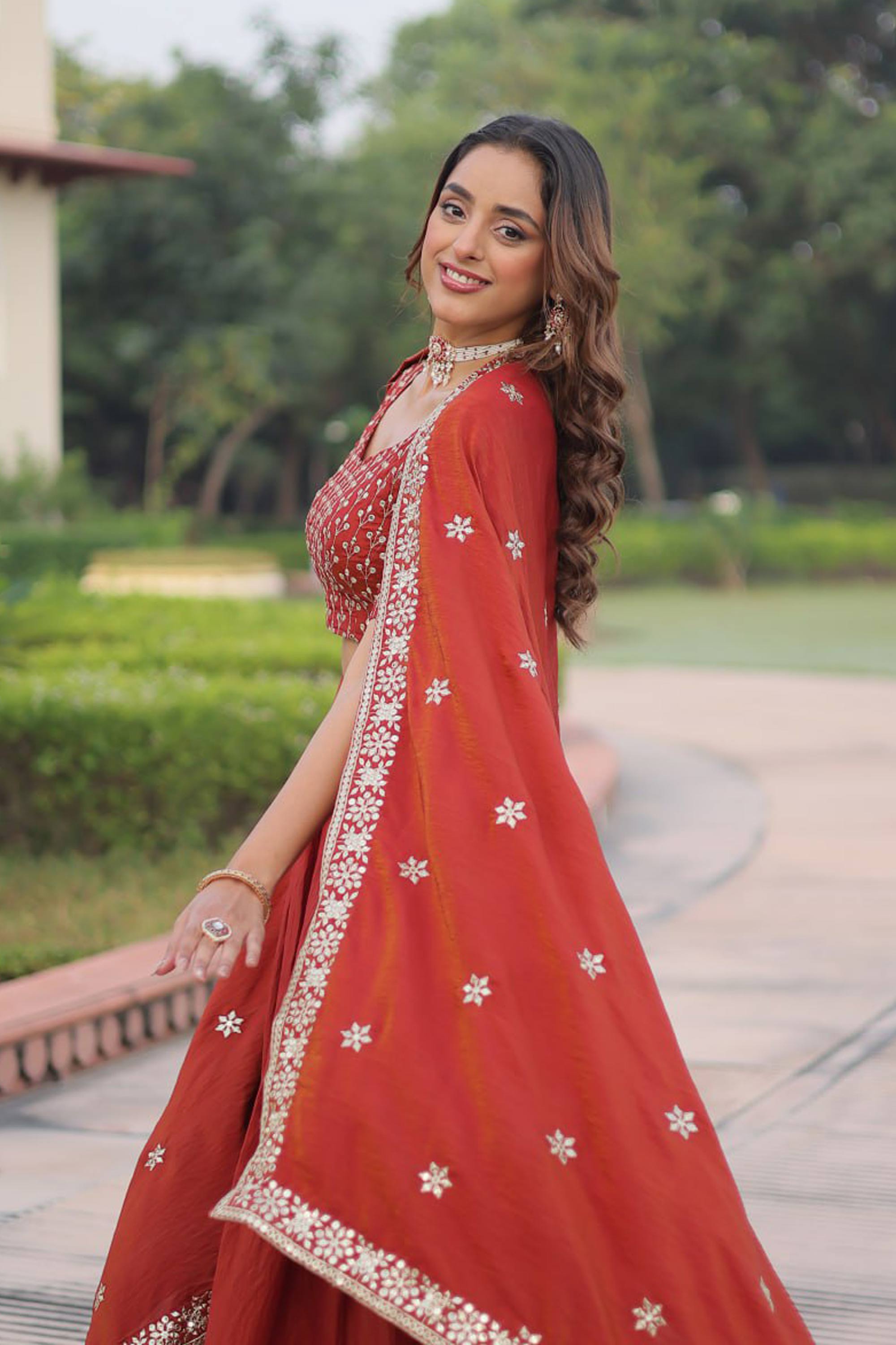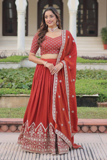 Rust Wedding Wear Art Silk Embroidered Lehenga Choli