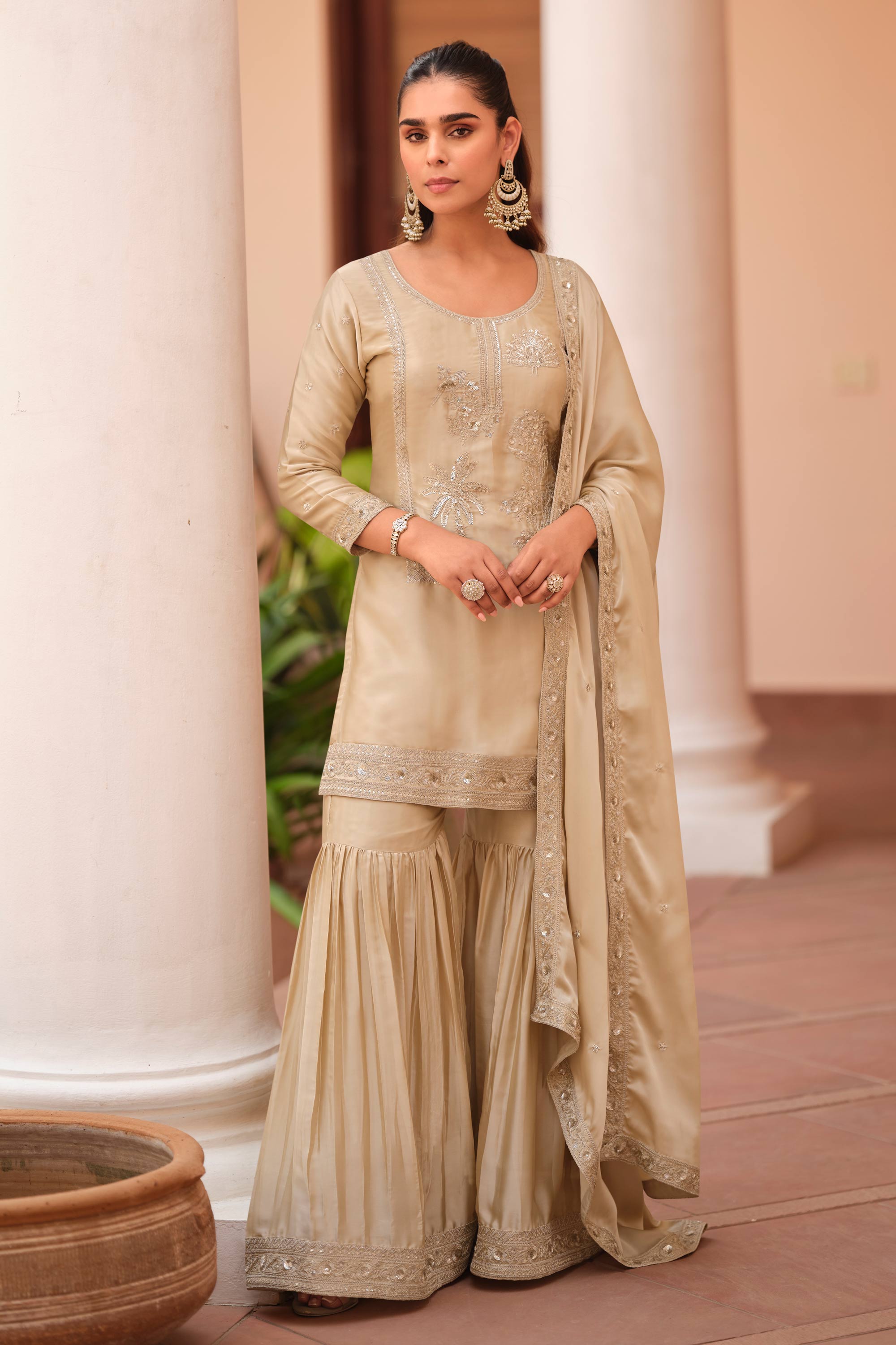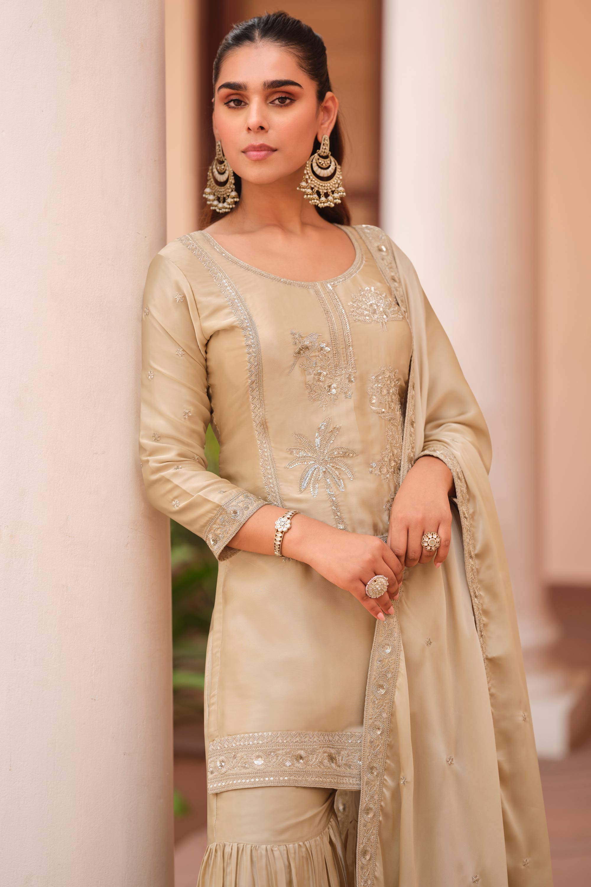 Beige Satin Silk Embroidered Readymade Palazzo Salwar Kameez