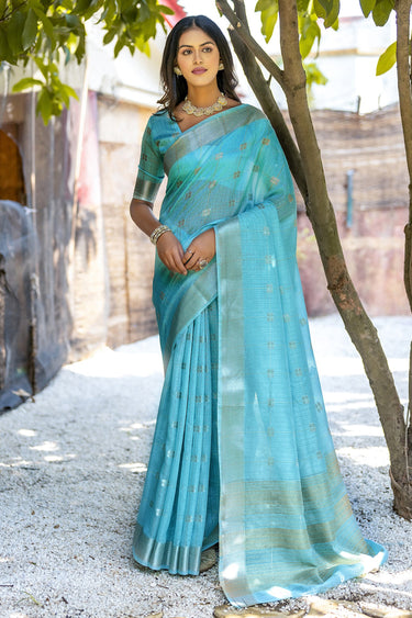 Cotton Fabric Sea Green Color Fancy Zari Woven Border Casual Saree
