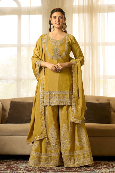Embroidered Chinon Silk Mustard Readymade Palazzo Suit For Wedding Wear