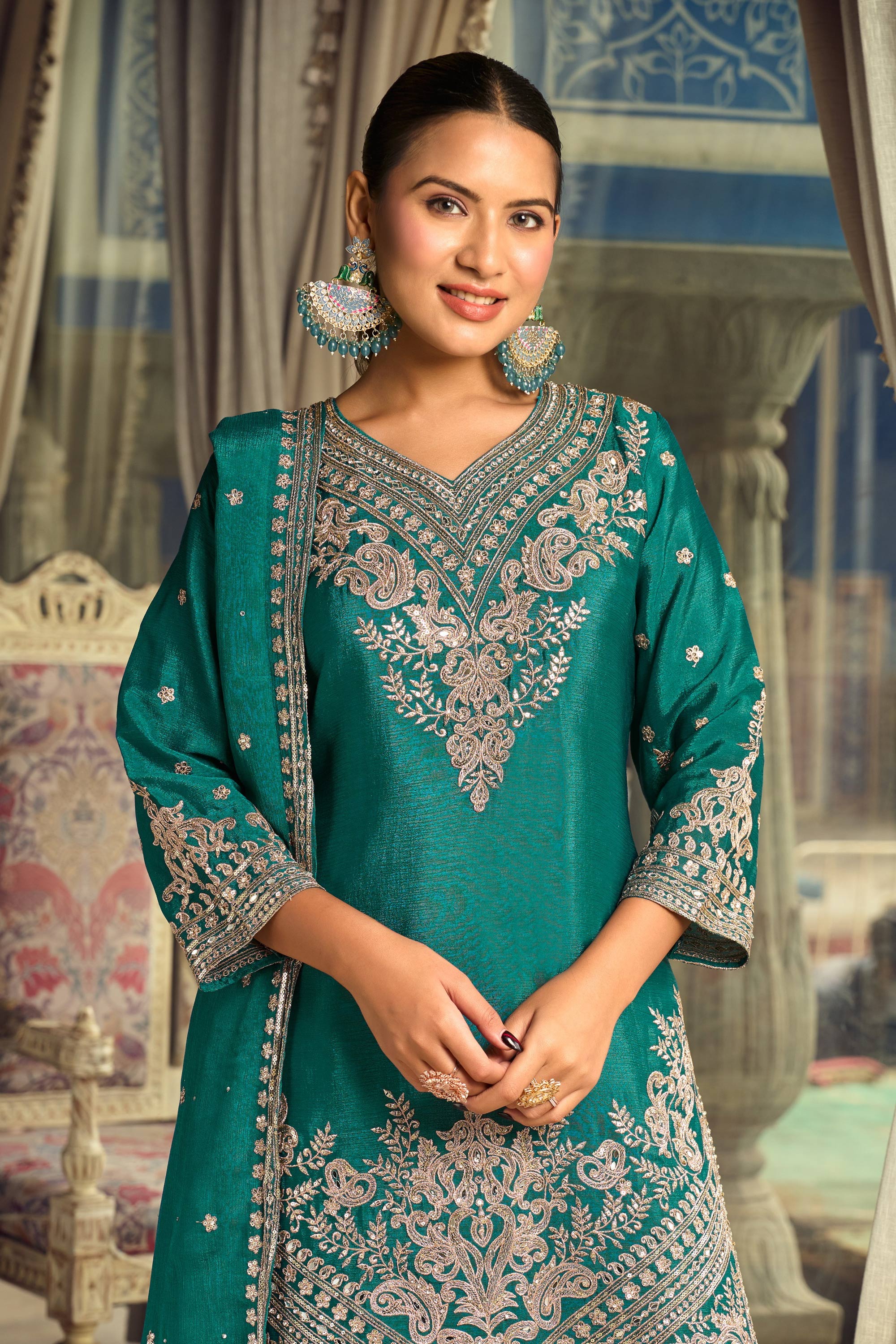 Embroidered Chinon Silk Teal Readymade Palazzo Suit For Sangeet Wear