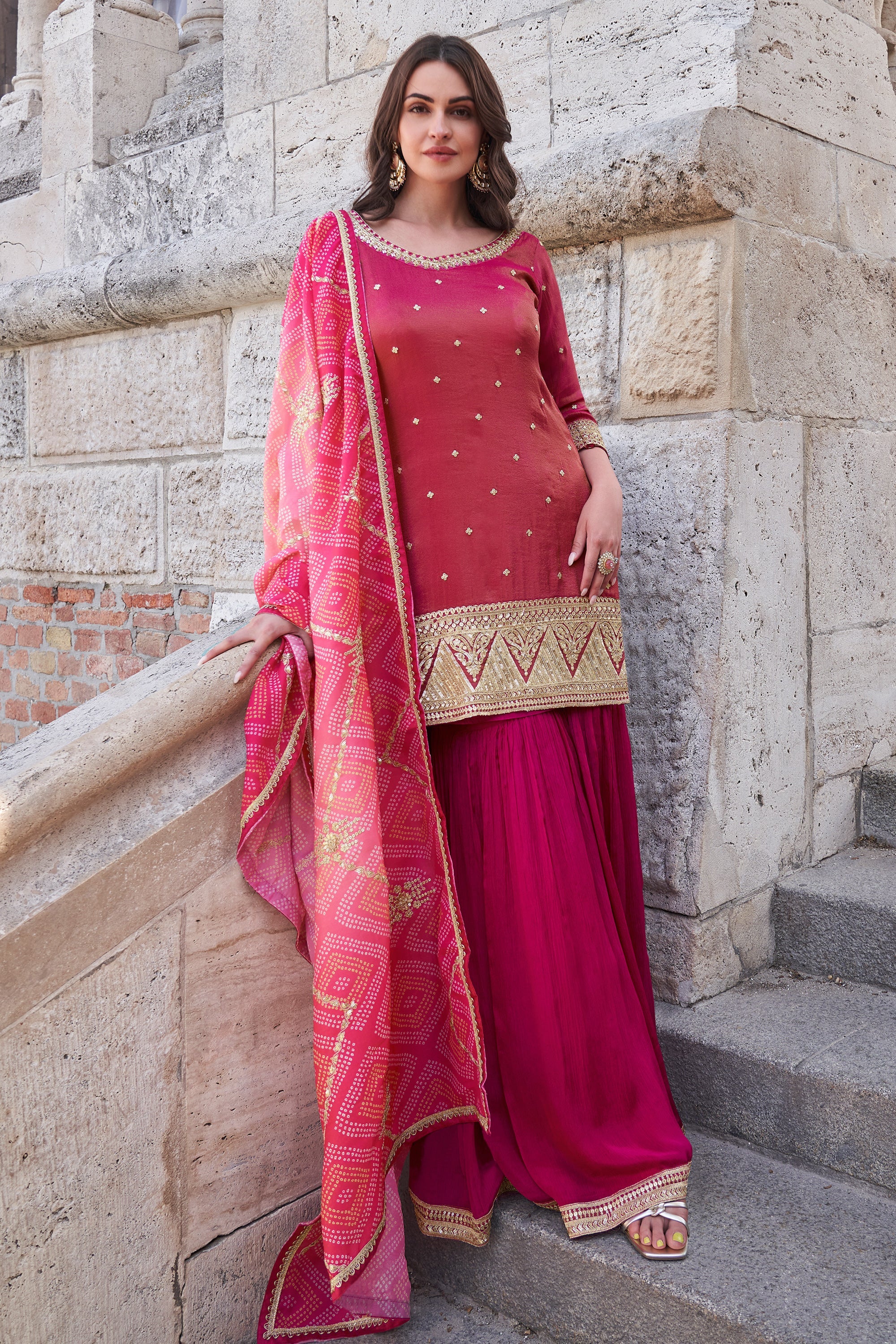 Elevate your style with the Embroidered Chinon Silk Readymade Palazzo Salwar Kameez, designed in a luxurious shade. Made from soft and breathable Chinon Silk, this outfit combines tradition with contemporary flair. The intricate embroidery enhances its visual appeal, making it ideal for weddings and festive gatherings. The palazzo pants offer maximum comfort and freedom, allowing you to enjoy your day with confidence. Pair it with statement jewelry for a refined, elegant look.