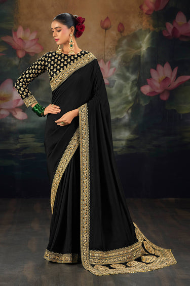 Silk Fabric Embroidered Black Sangeet Wear Saree