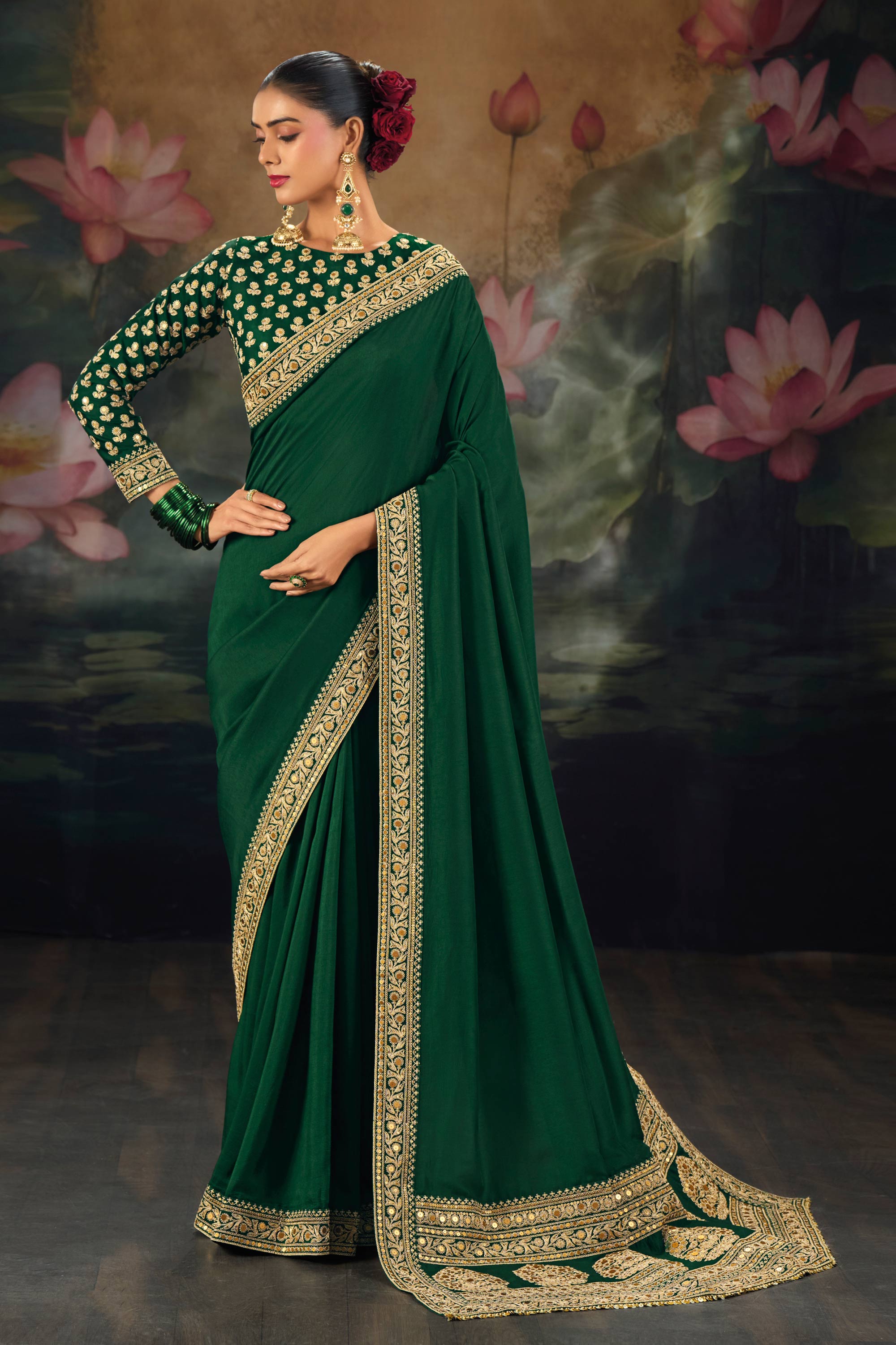 Silk Fabric Embroidered Dark Green Sangeet Wear Saree