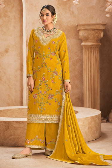 Yellow Color Embroidered Chinon Readymade Palazzo Salwar Suit