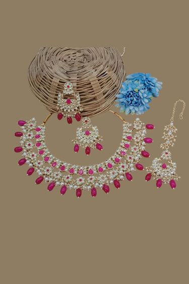 Alloy Material Wondrous Necklace Set Earrings And Mang Tikka For Women In Rani Color
