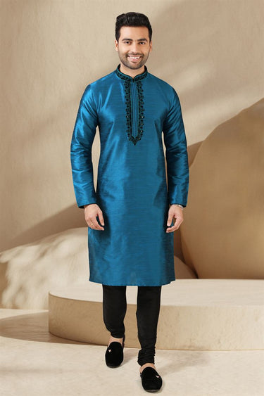 Alluring Cyan Color Banarasi Art Silk Fabric Festive Wear Readymade Kurta Pyjama For Men