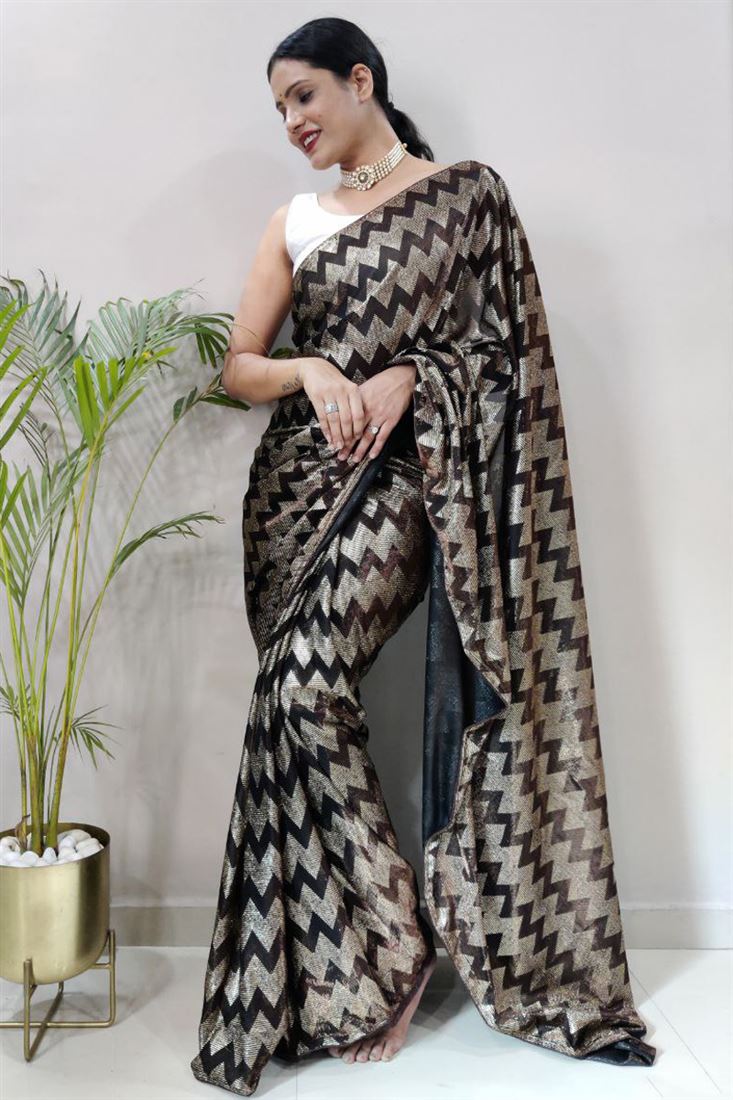 Alluring Fancy Fabric Brown Color Foil Printed Ready to Wear Saree