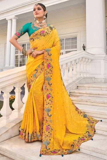 Alluring Yellow Color Stone and Thread Work Crepe Saree
