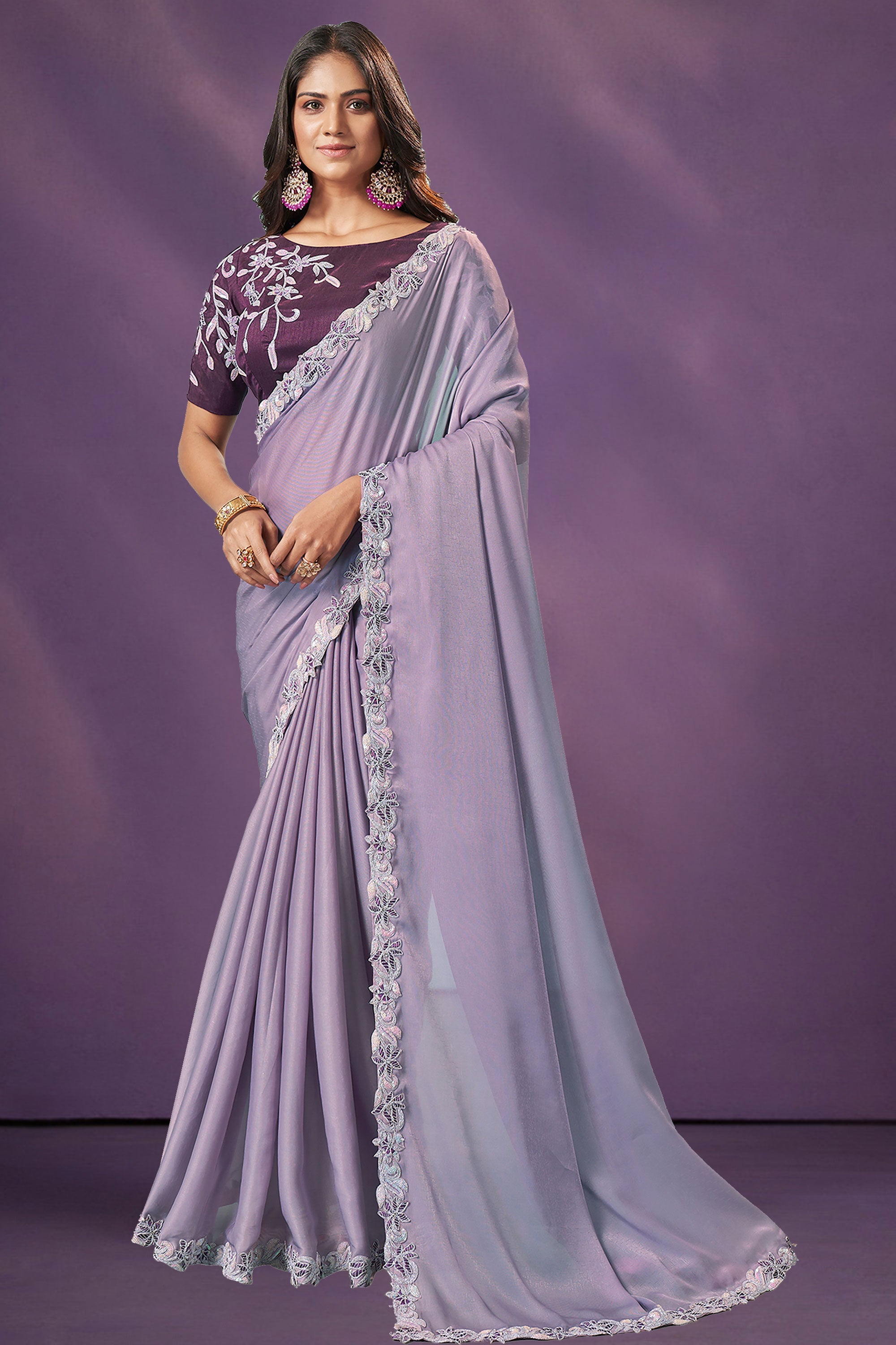 Amazing Lavender Color Organza Fabric Saree With Embroidered Work