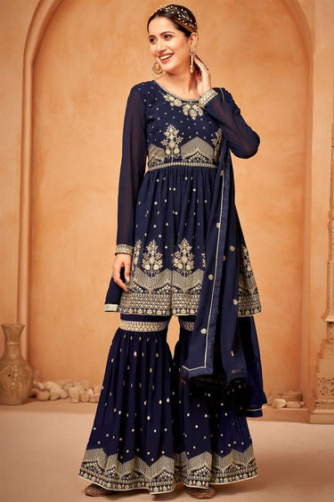 Appealing Georgette Fabric Sangeet Wear Sharara Suit In Navy Blue Color