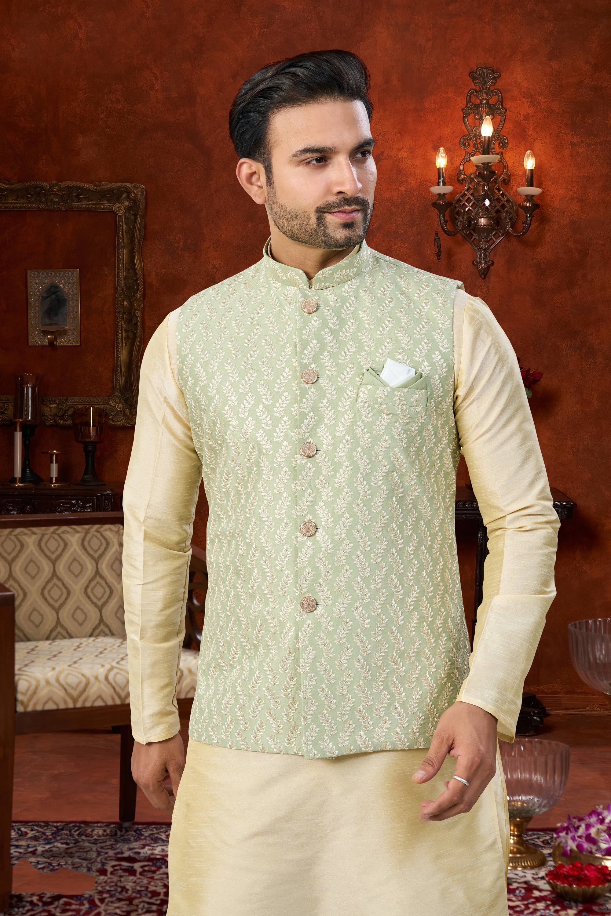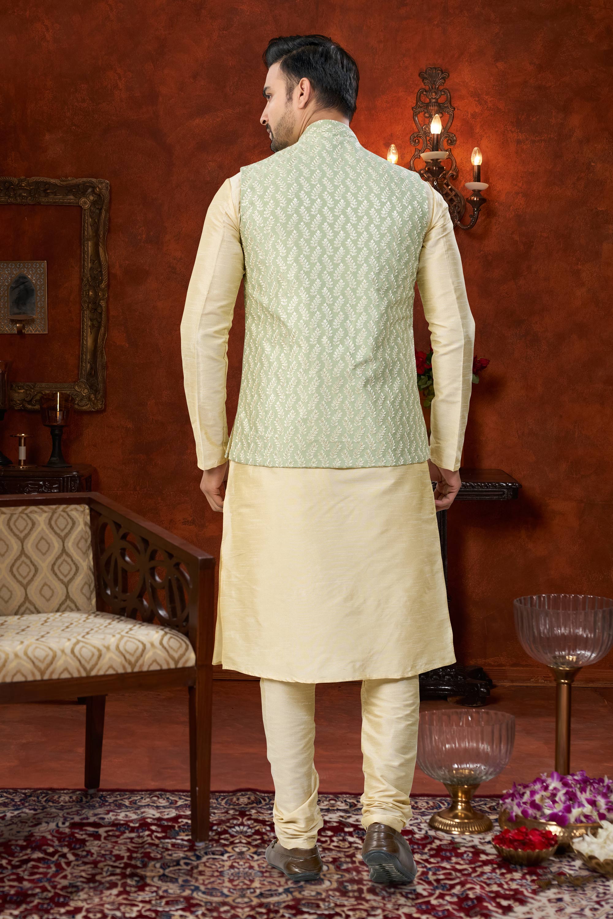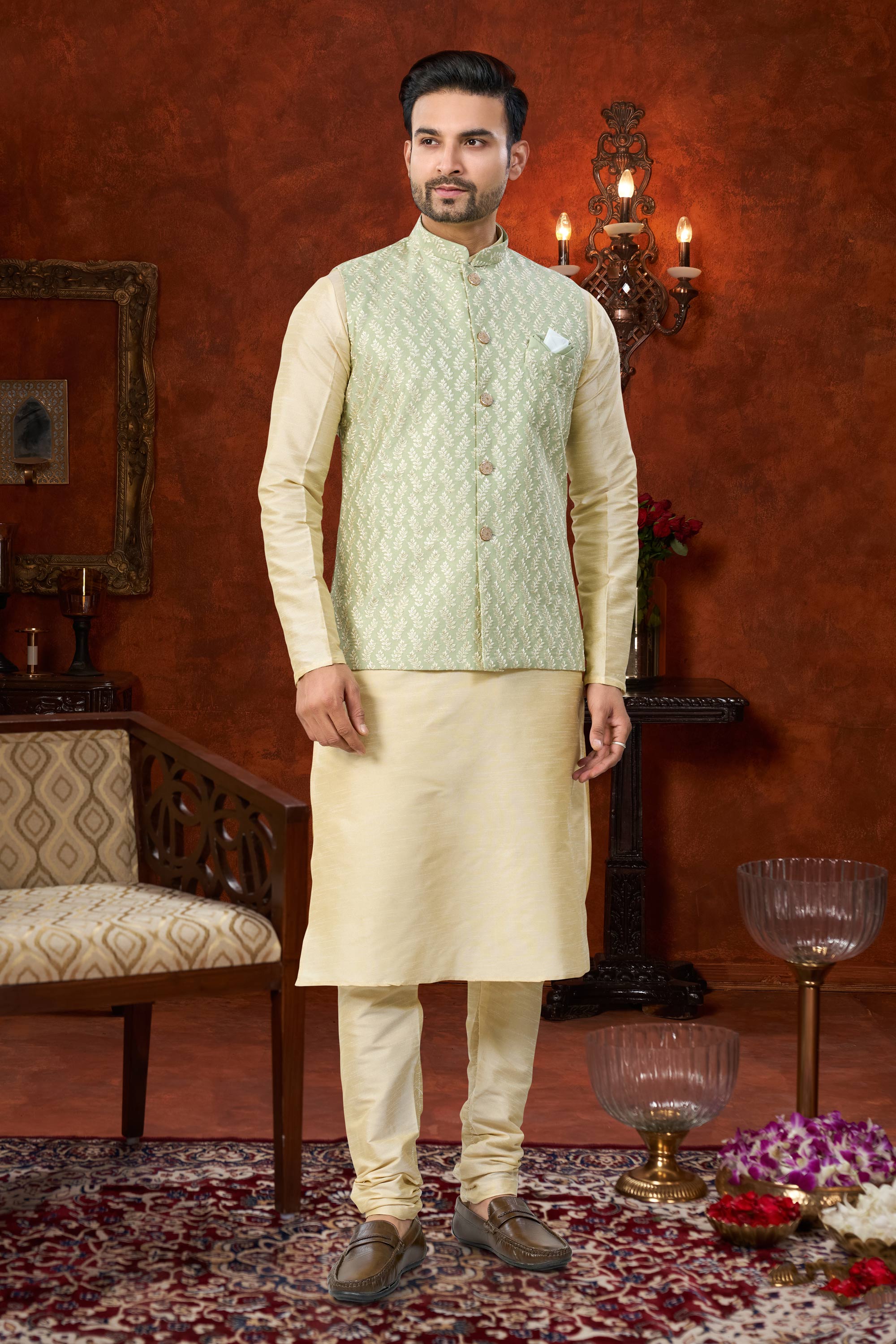 This Mens Kurta Pyjama set blends traditional charm with modern comfort. Featuring an Art Silk kurta and a Dhupion Silk pyjama bottom, it creates a refined festive look. The rich color makes it an ideal choice for weddings and special celebrations. Please note that slight color variations may occur due to digital photography.