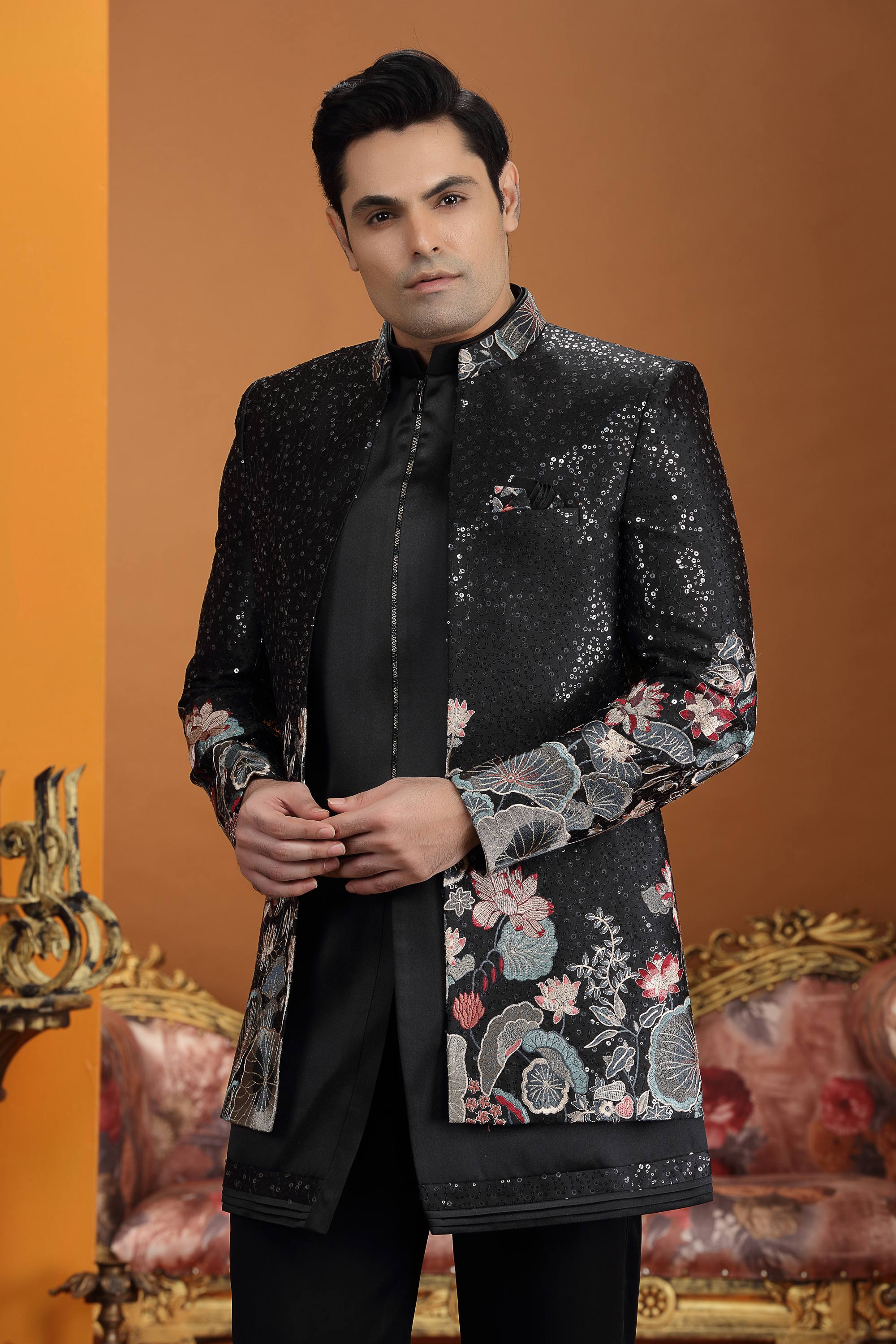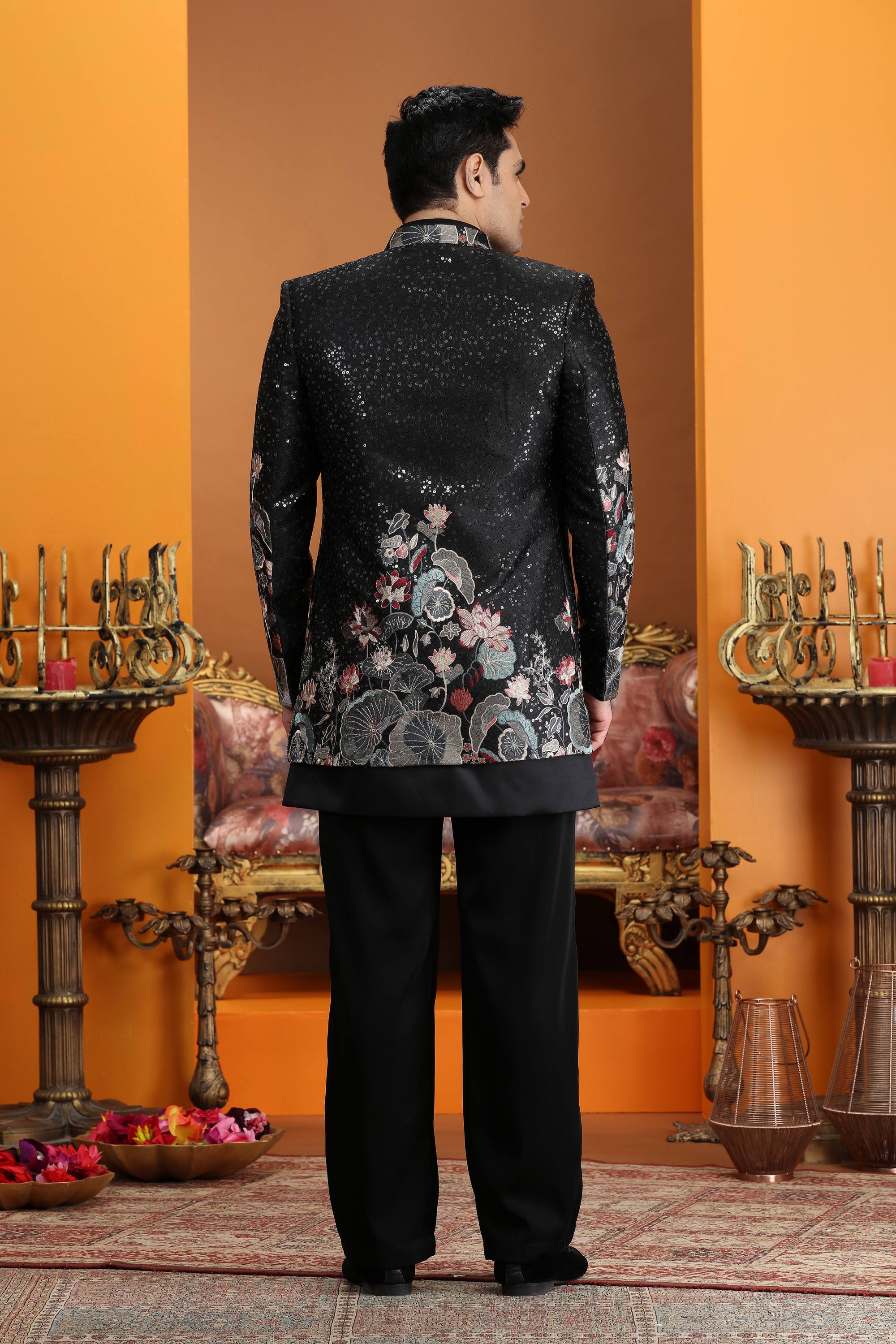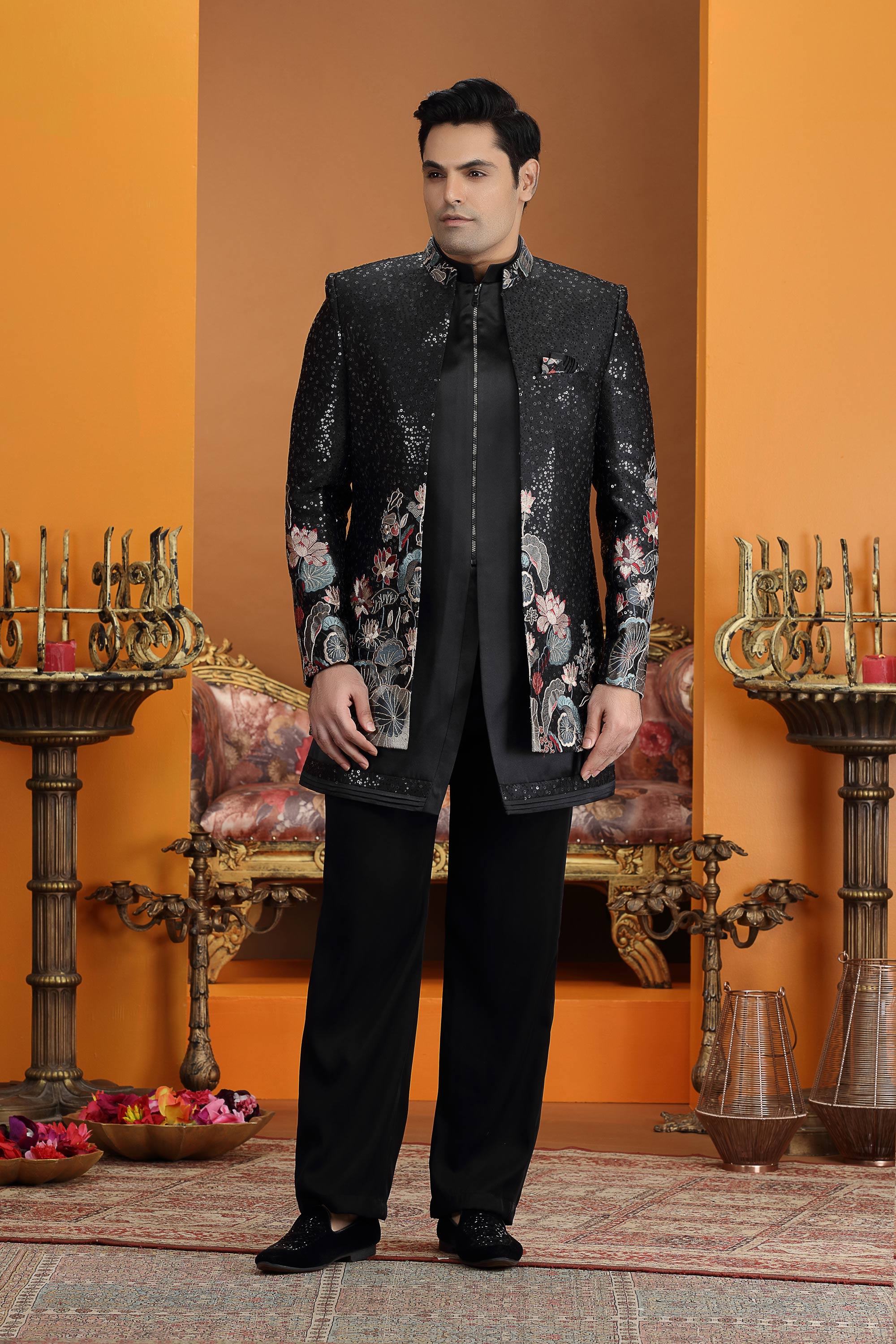 Art Silk Black Wedding Wear 3 Piece Indo Western For Men