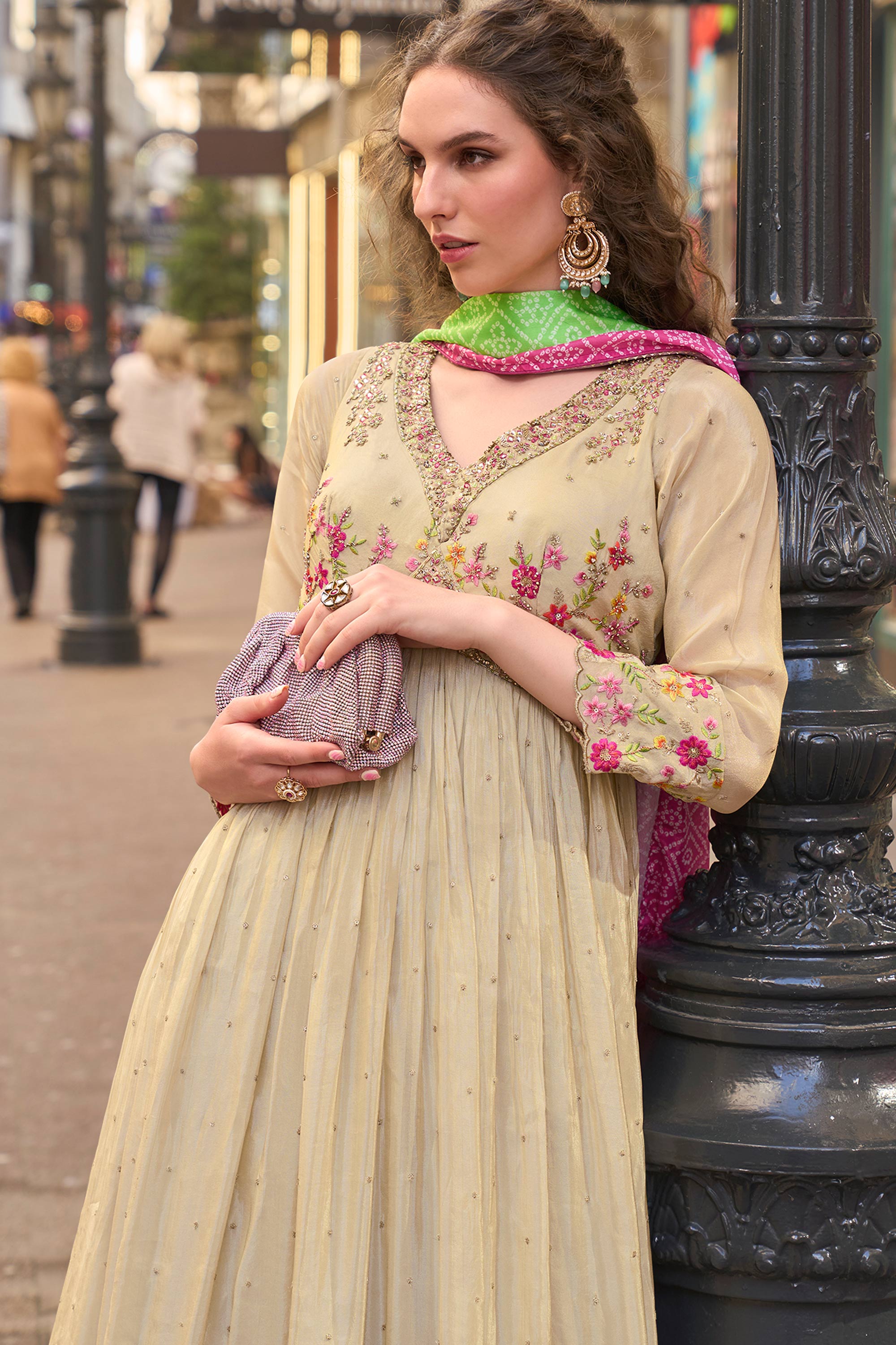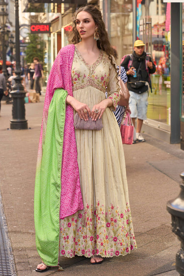 Elevate your festive style with this Art Silk Embroidered Anarkali Gown in a sophisticated beige hue. Perfect for functions and celebrations, this gown features exquisite embroidery that showcases elegance. Made with lightweight and smooth art silk fabric, it offers all-day comfort without compromising on glamour. The included dupatta completes the ensemble with grace, giving you a complete look that's ready to impress. Designed in a flattering silhouette, it combines traditional aesthetics with modern appeal. A must-have for special occasions, this readymade gown ensures you stand out effortlessly.