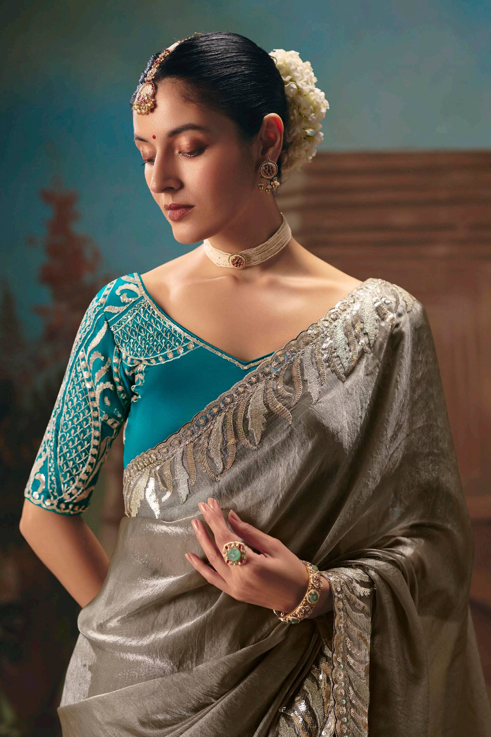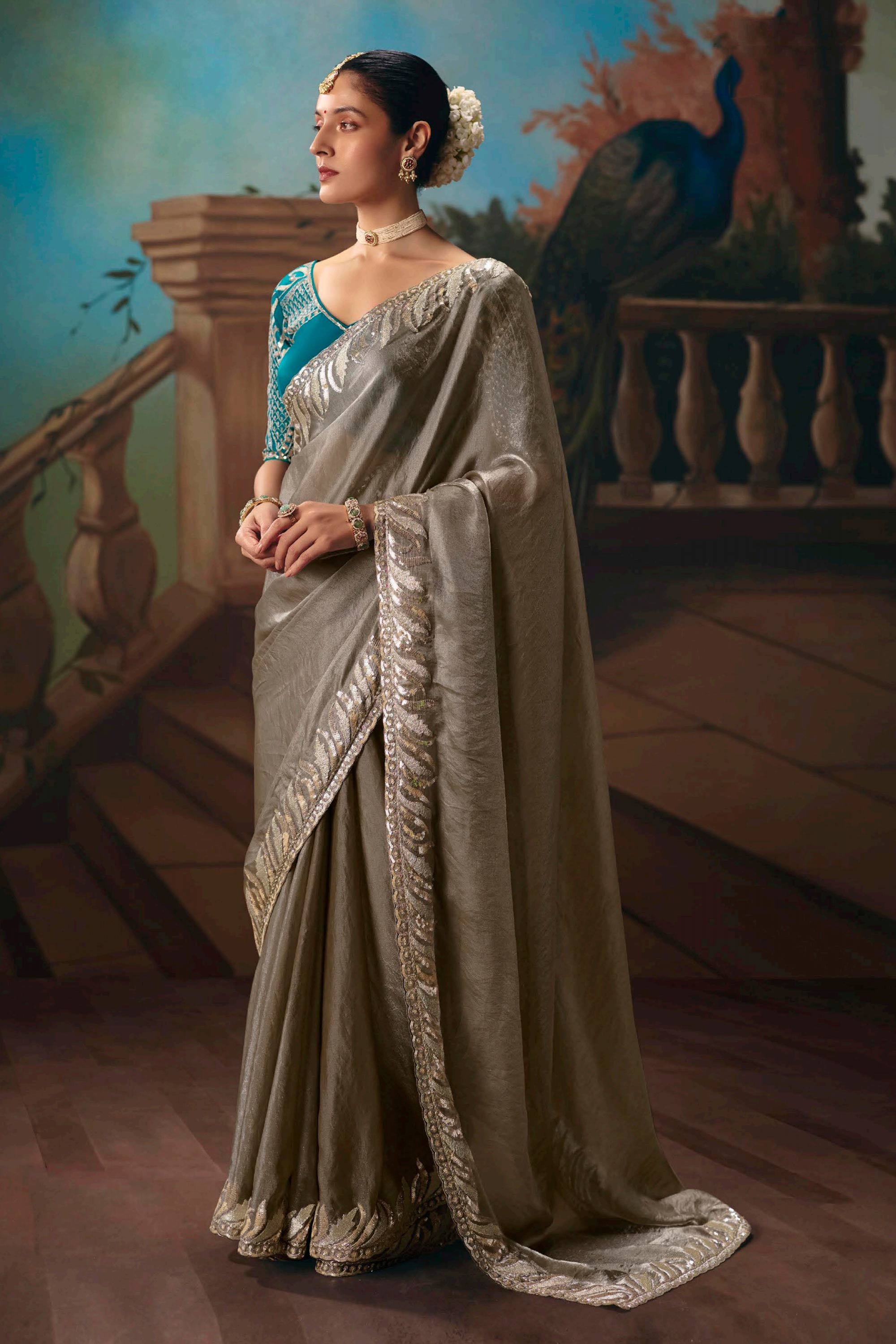 Art Silk Embroidered Grey Saree For Wedding Wear