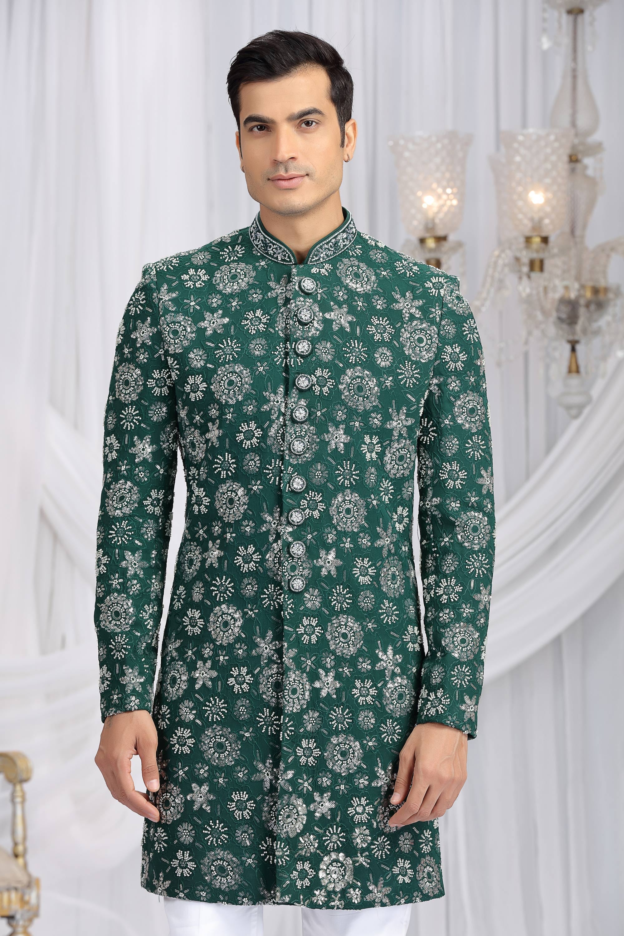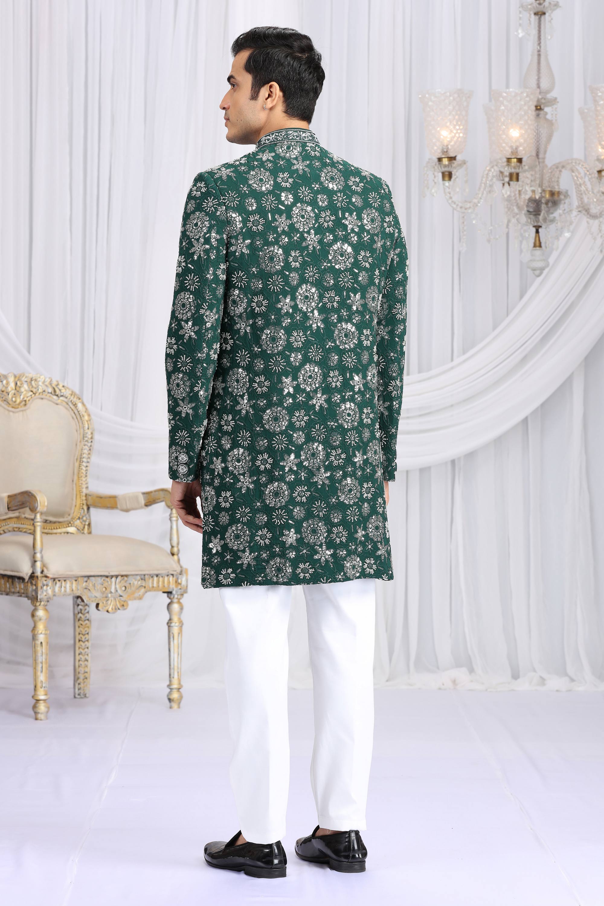 Art Silk Embroidered Teal Readymade Indo Western For Men
