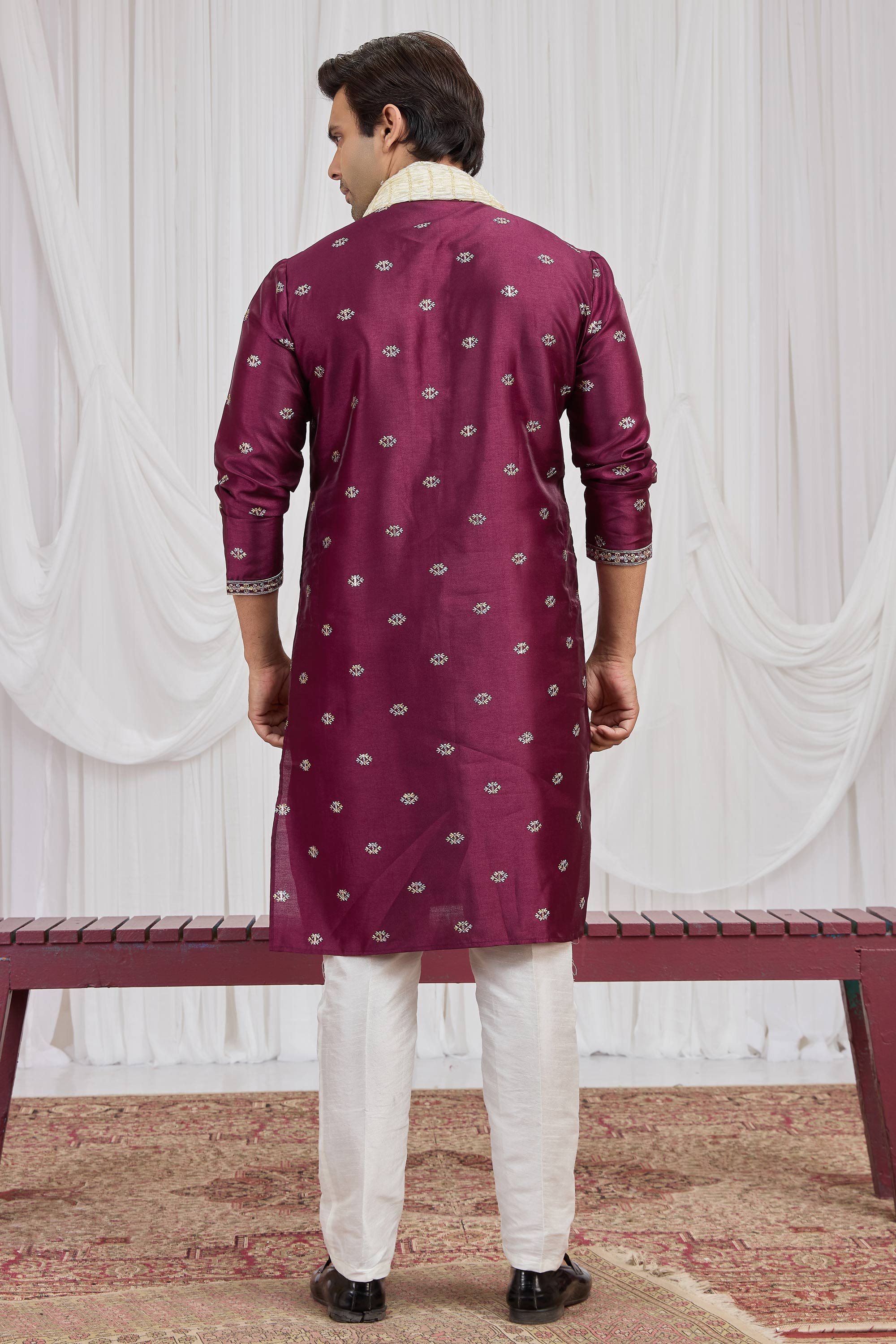 Art Silk Embroidered Wine Readymade Kurta Pyjama With Dupatta For Men
