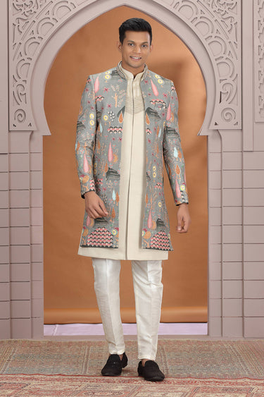 Art Silk Embroidery Grey Readymade 3 Piece Indo Western For Men