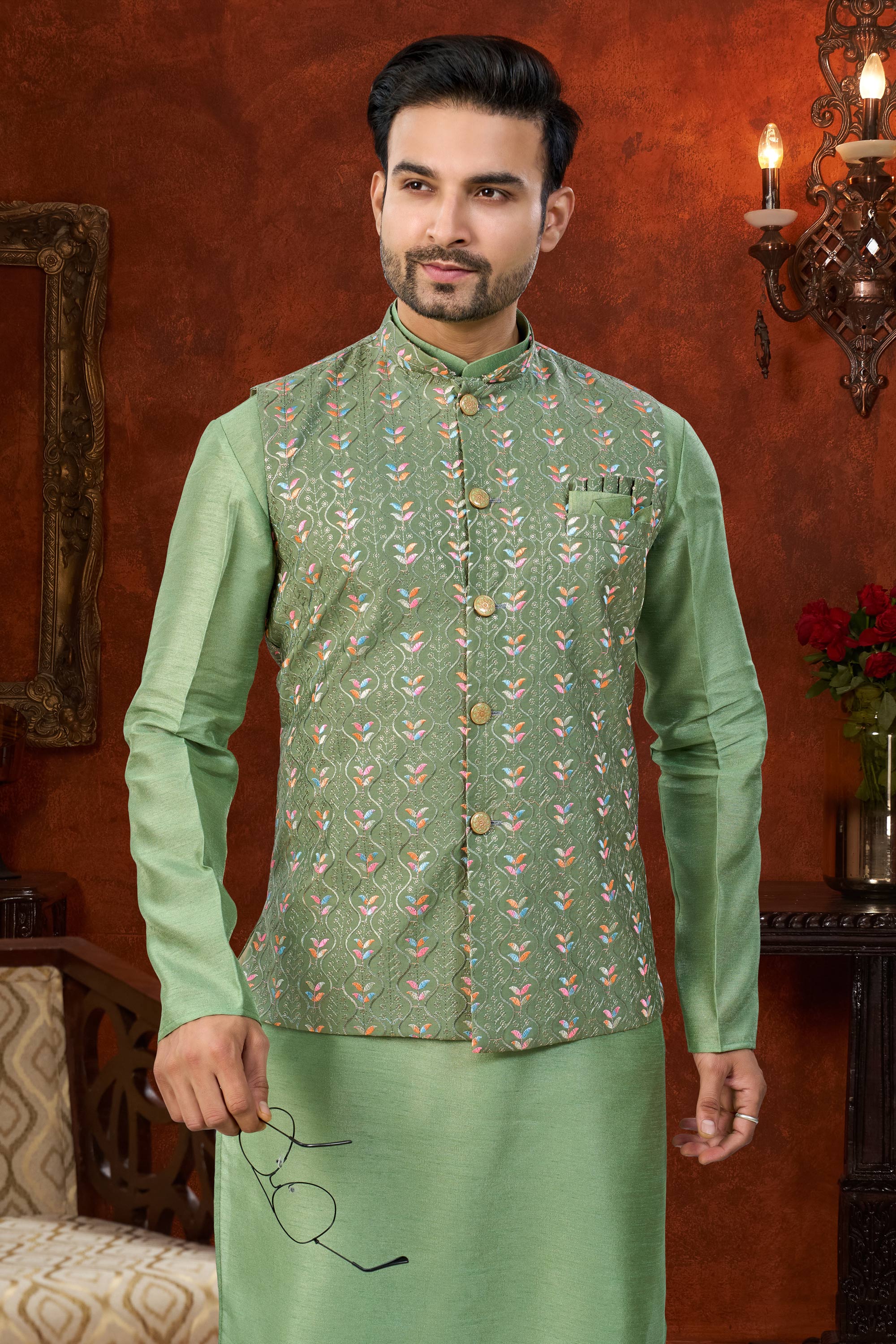 Add grace to your traditional wardrobe with this Mens Kurta Pyjama made from premium Art Silk. The Dhupion Silk pyjama bottom ensures comfort and a polished appearance. Its rich color makes it perfect for weddings and festive events. Slight color variation may occur due to digital photography.