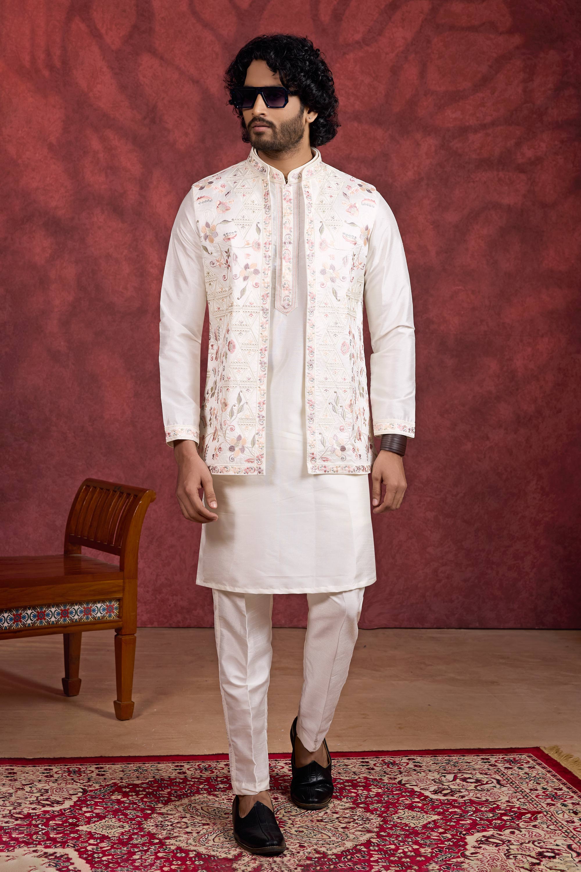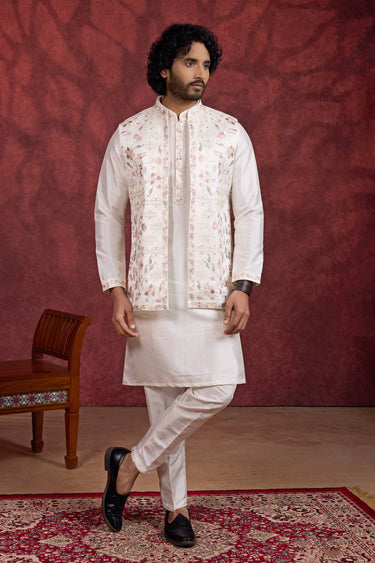 Art Silk Fabric Off White Readymade Kurta Pyjama With Jacket For Men