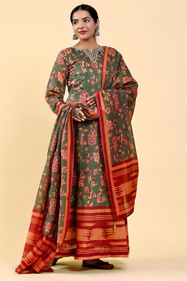Art Silk kalamkari Printed Bewitching Olive Color Gown With Dupatta