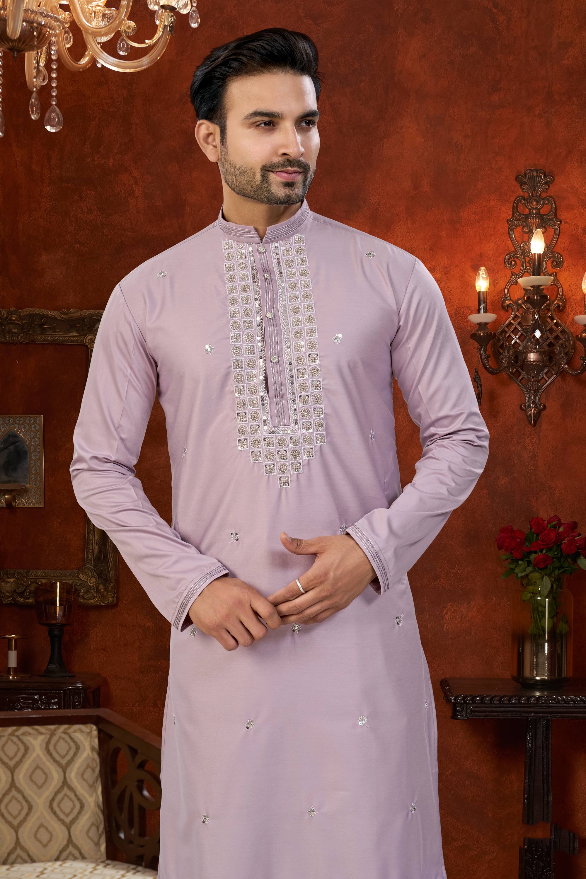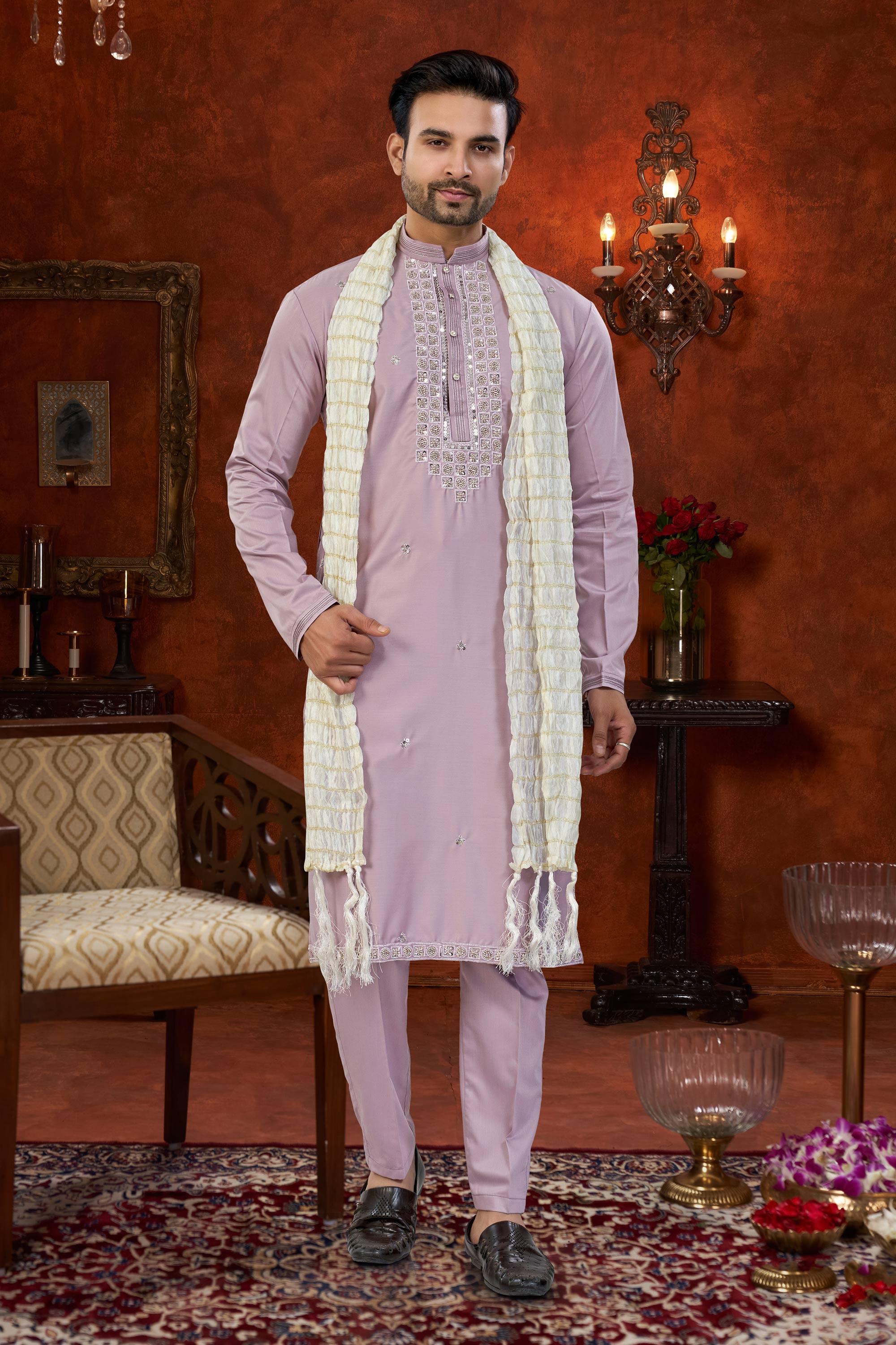 Art Silk Lavender Wedding Wear Readymade Kurta Pyjama For Men