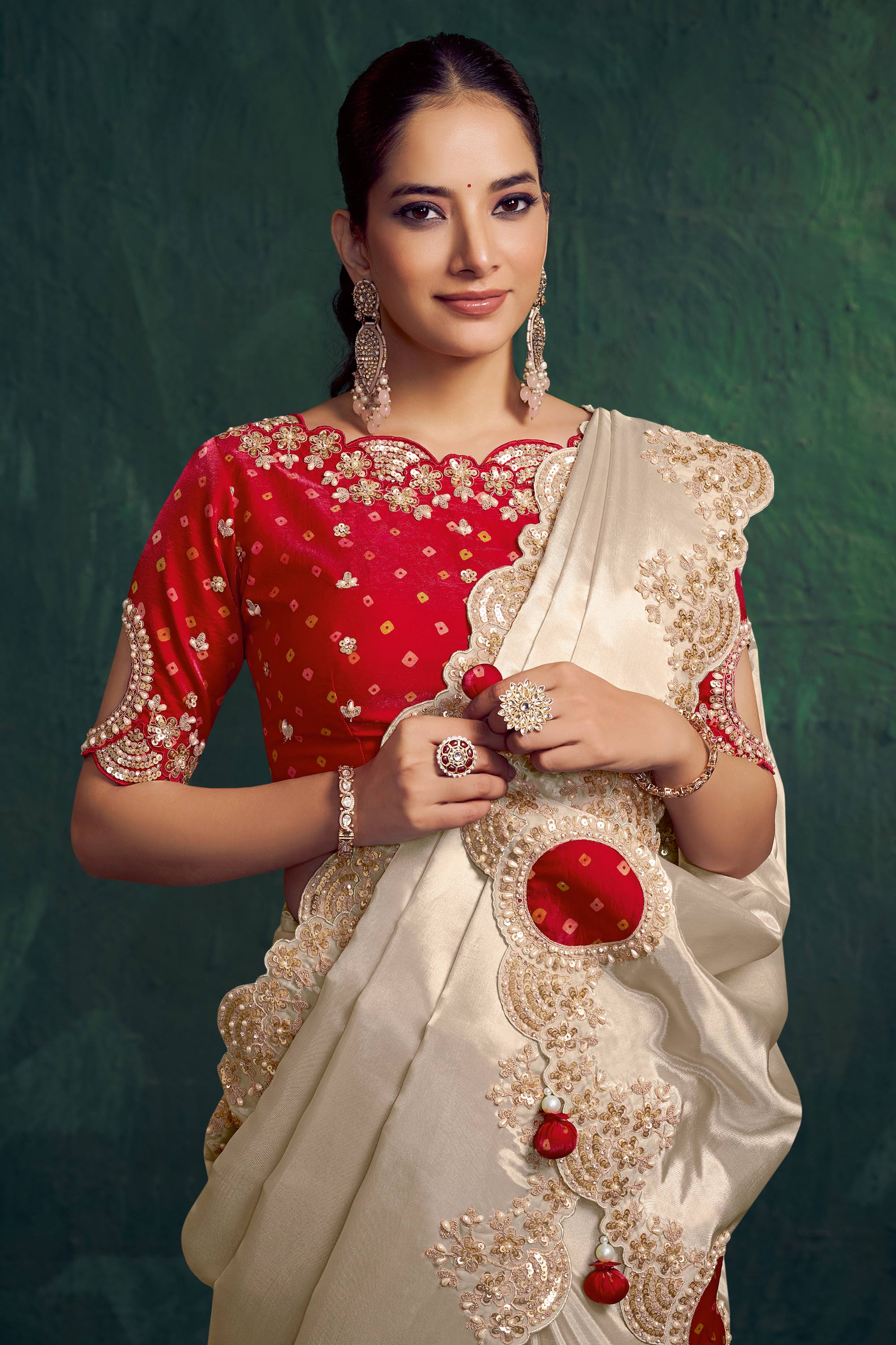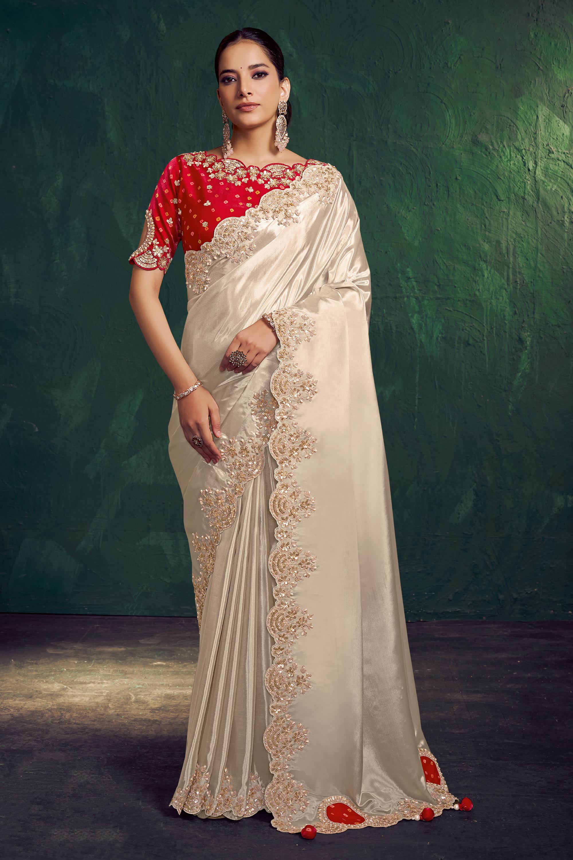Art Silk Off White Embroidered Border Work Wedding Wear Readymade Saree