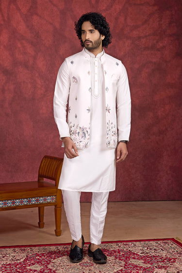 Art Silk Off White Wedding Wear Readymade Kurta And Aligadhi Pant For Men