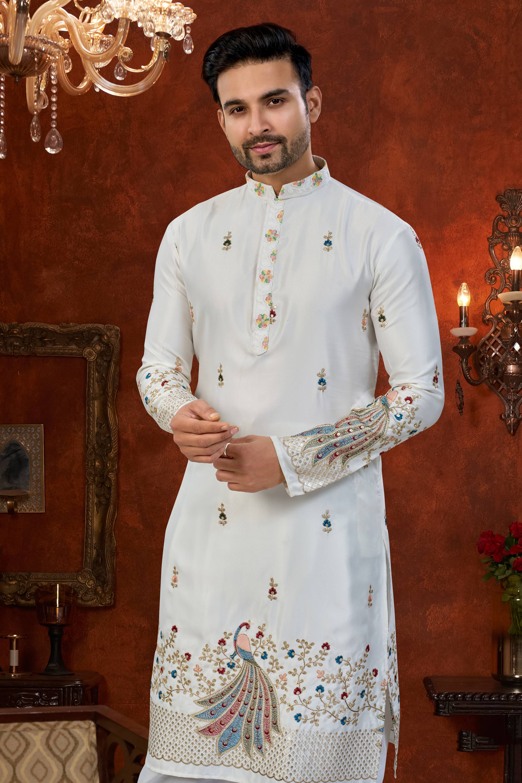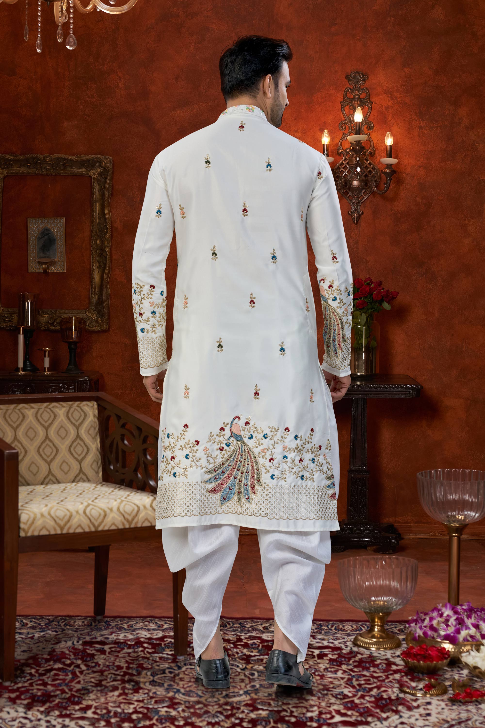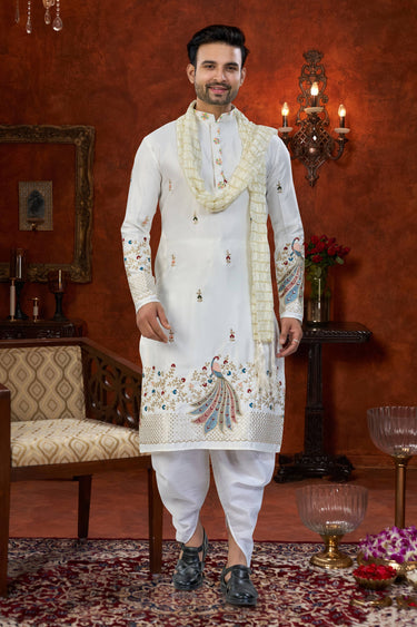 Art Silk Off White Wedding Wear Readymade Kurta With Dhoti For Men