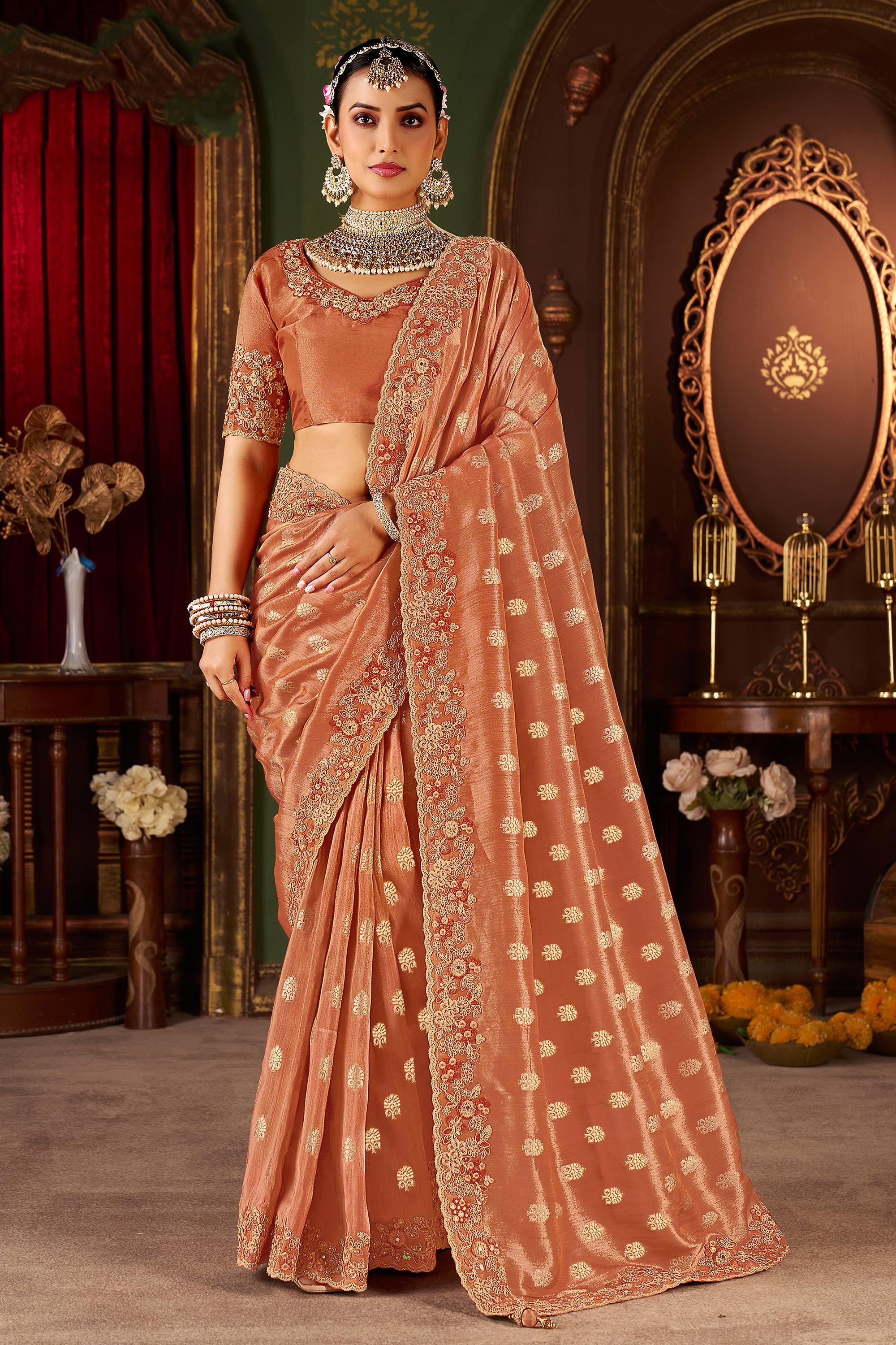 Art Silk Rust Embroidered Border Work Saree For Sangeet Wear