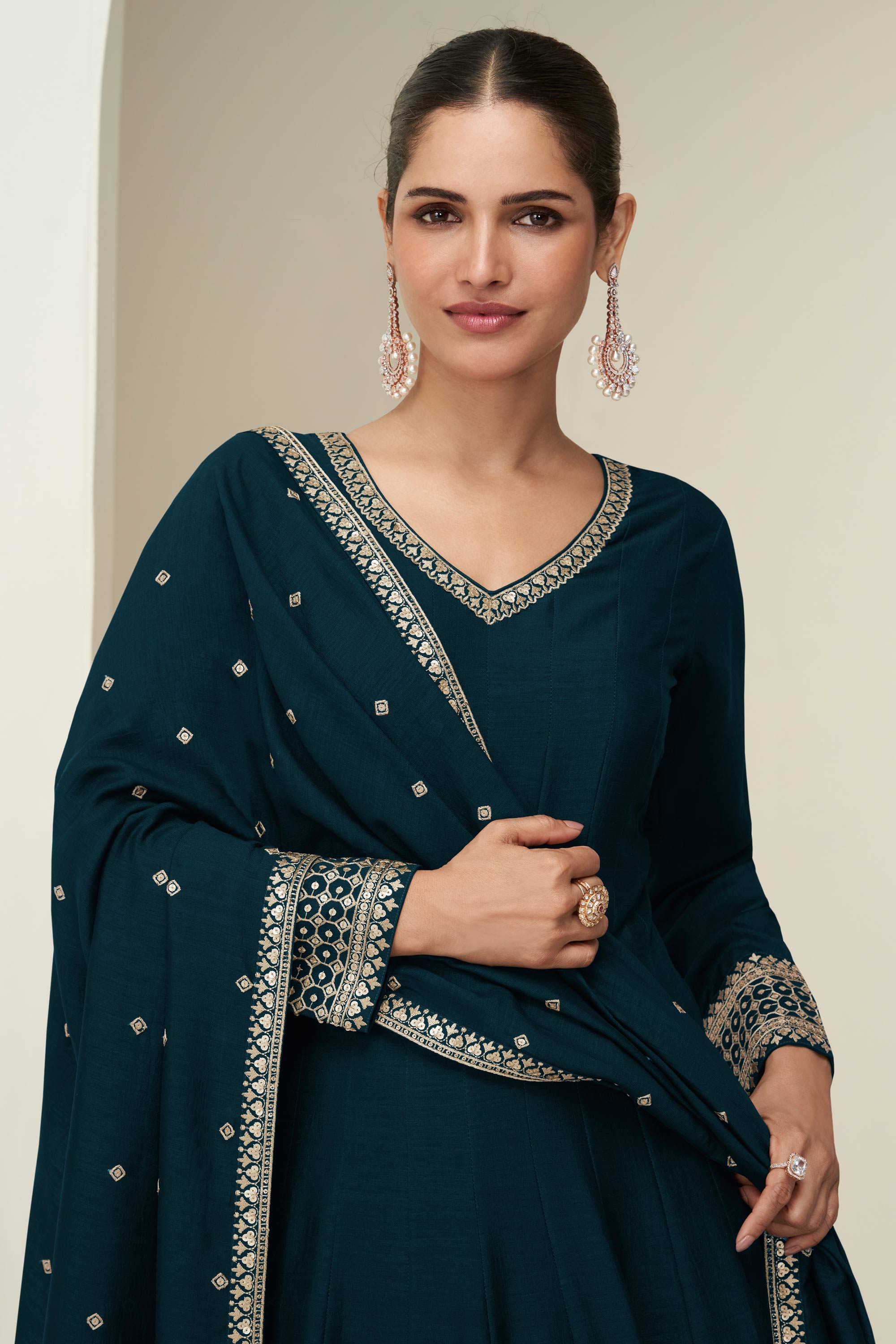 Art Silk Teal Floor Touch Readymade Gown With Dupatta