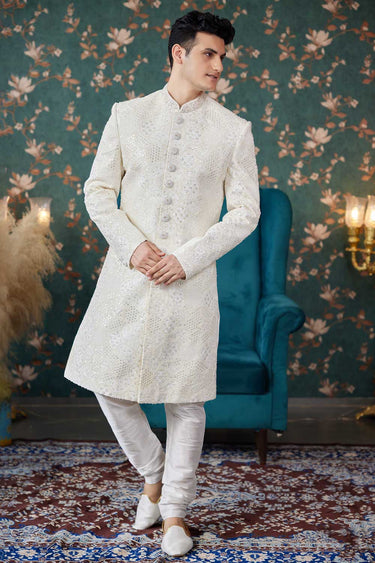 Attractive Cream Color Wedding Wear Sherwani For Men In Art Silk Fabric