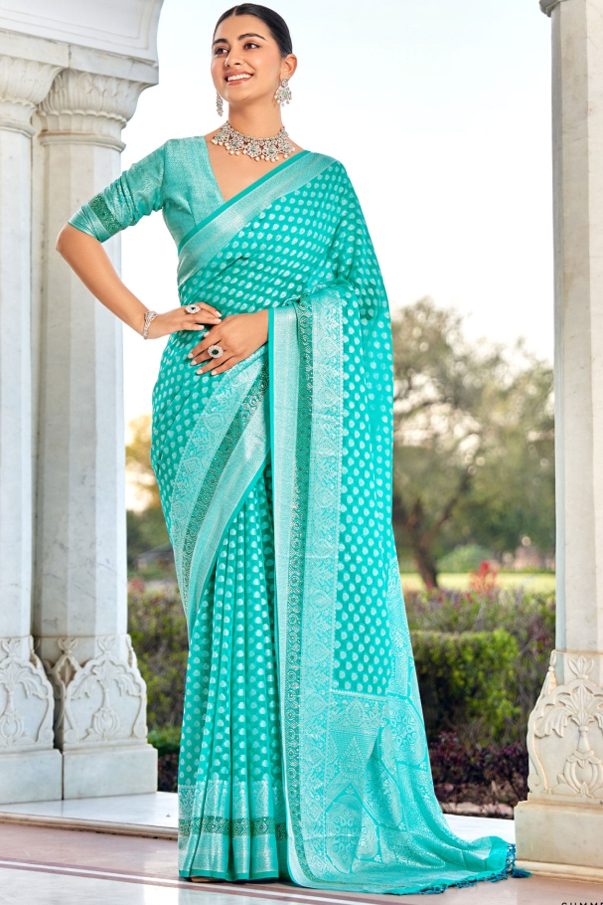 Attractive Festival Wear Cyan Color Weaving Work Georgette Saree