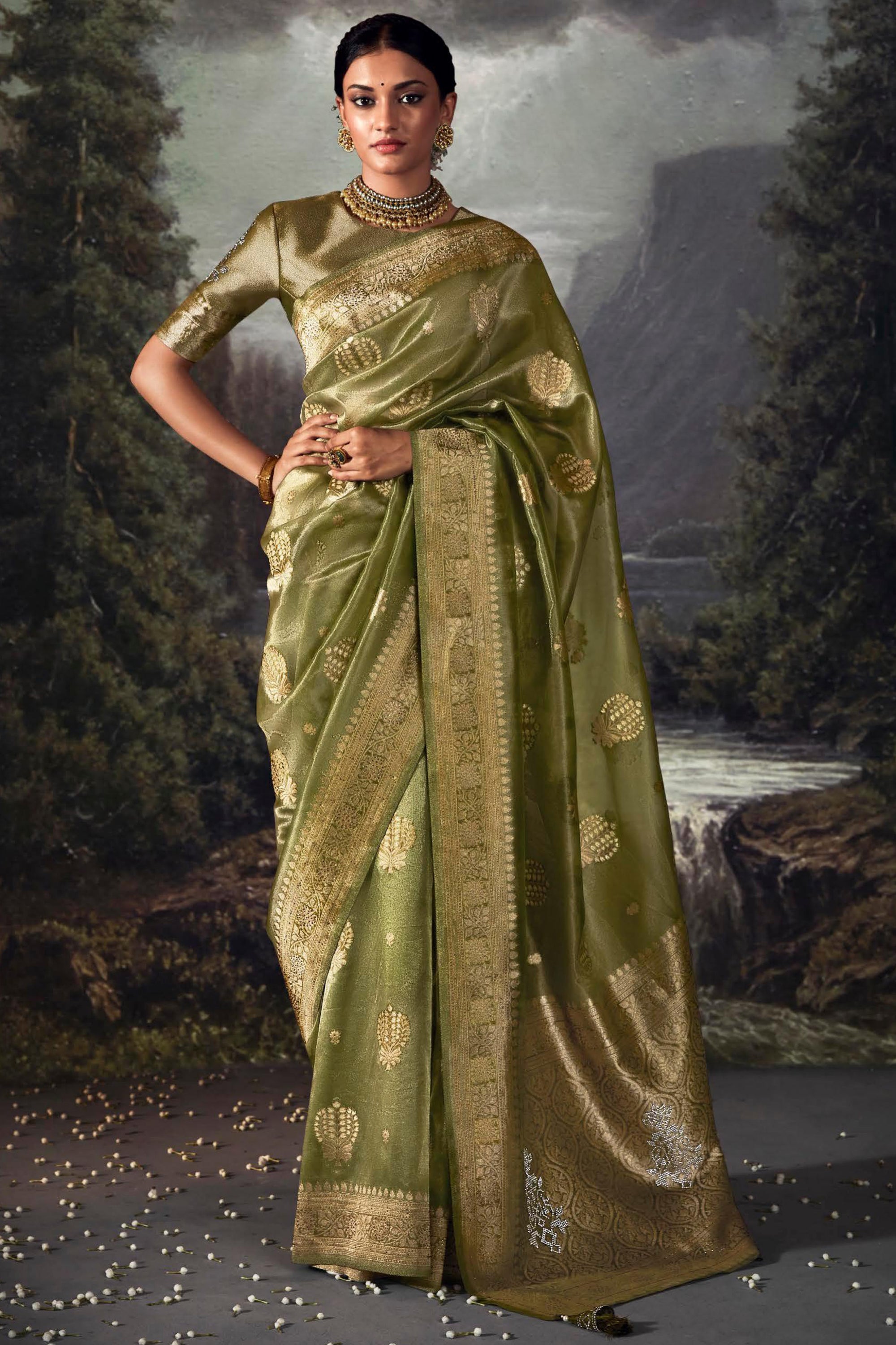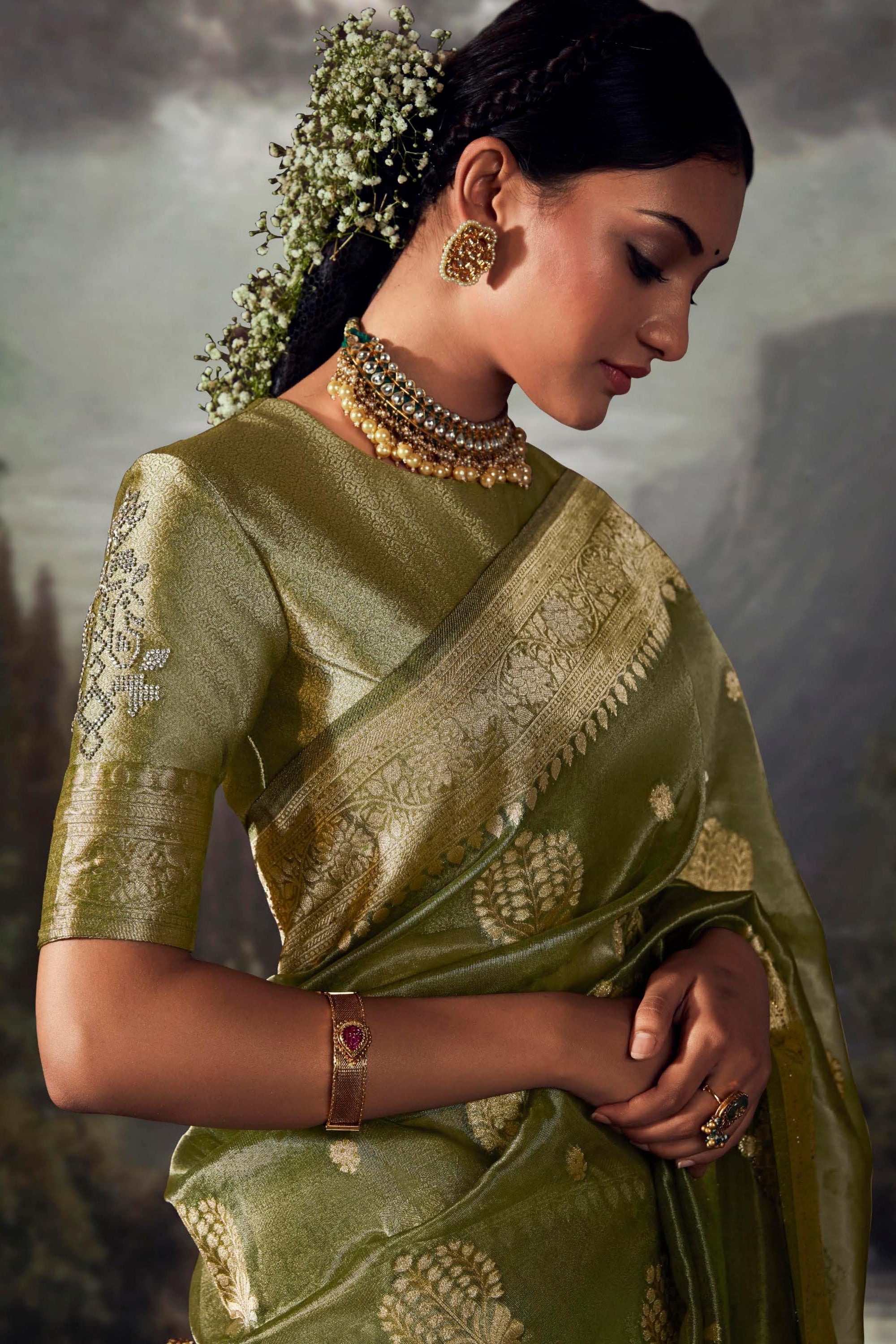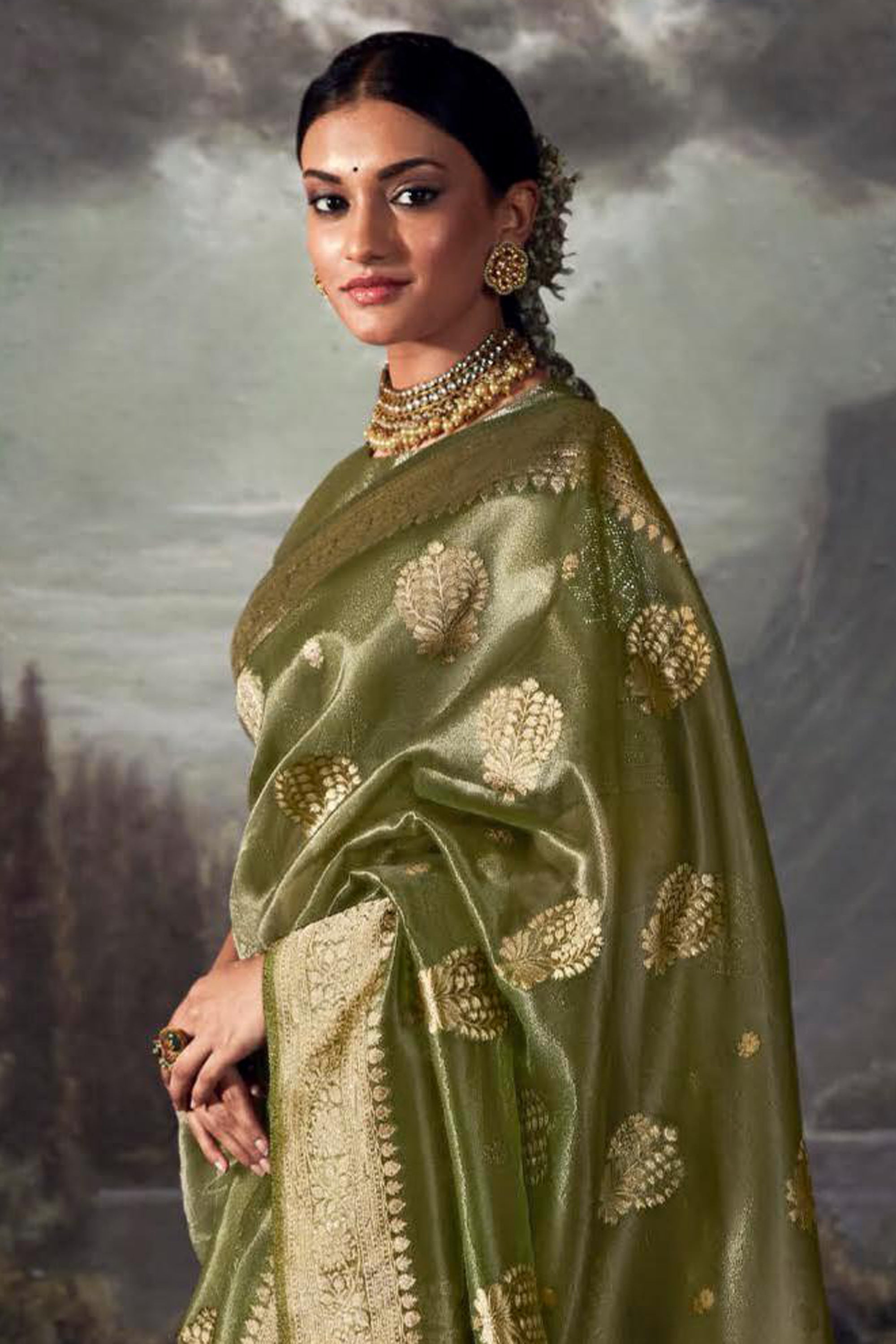 Banarasi Silk Fabric Weaving Work Rich Green Color Festive Wear Saree