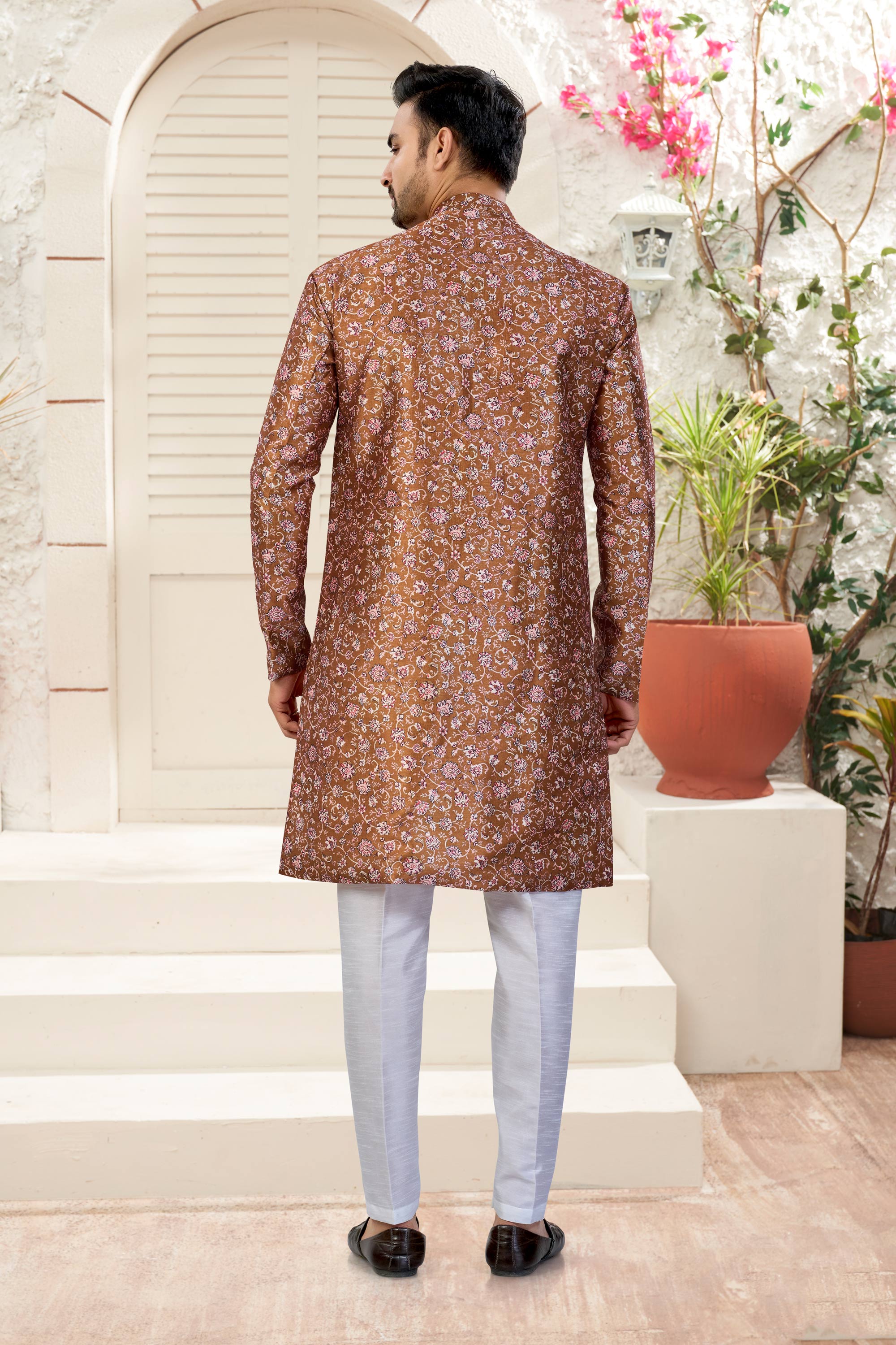 Enhance your festive wardrobe with this stylish Mens Indo Western Outfit. The outfit features a coordinated top and Silk Dhupion pyjama bottom that offers both comfort and elegance. The rich color makes it perfect for weddings and special occasions. Slight color variation may occur due to digital photography.