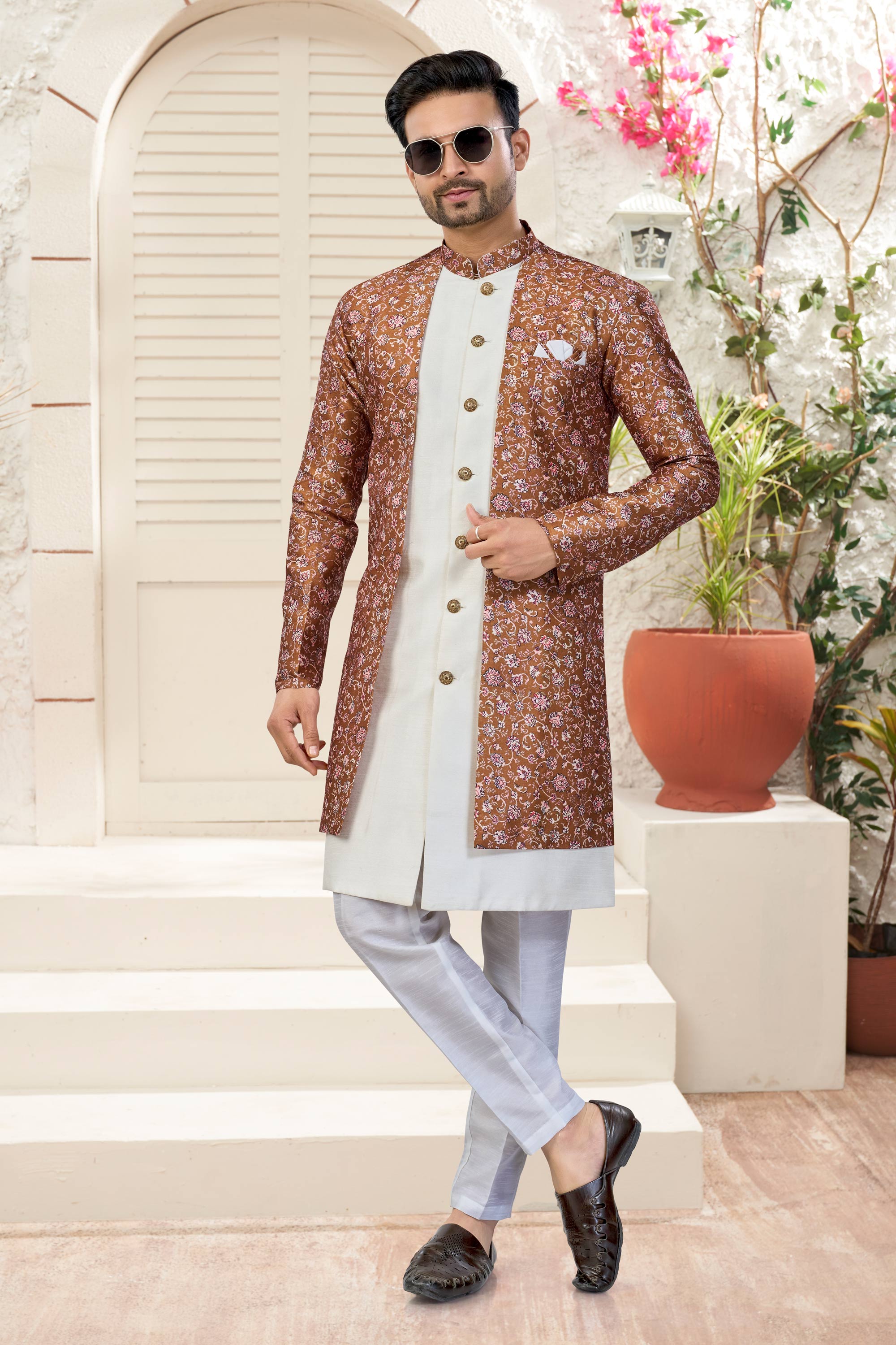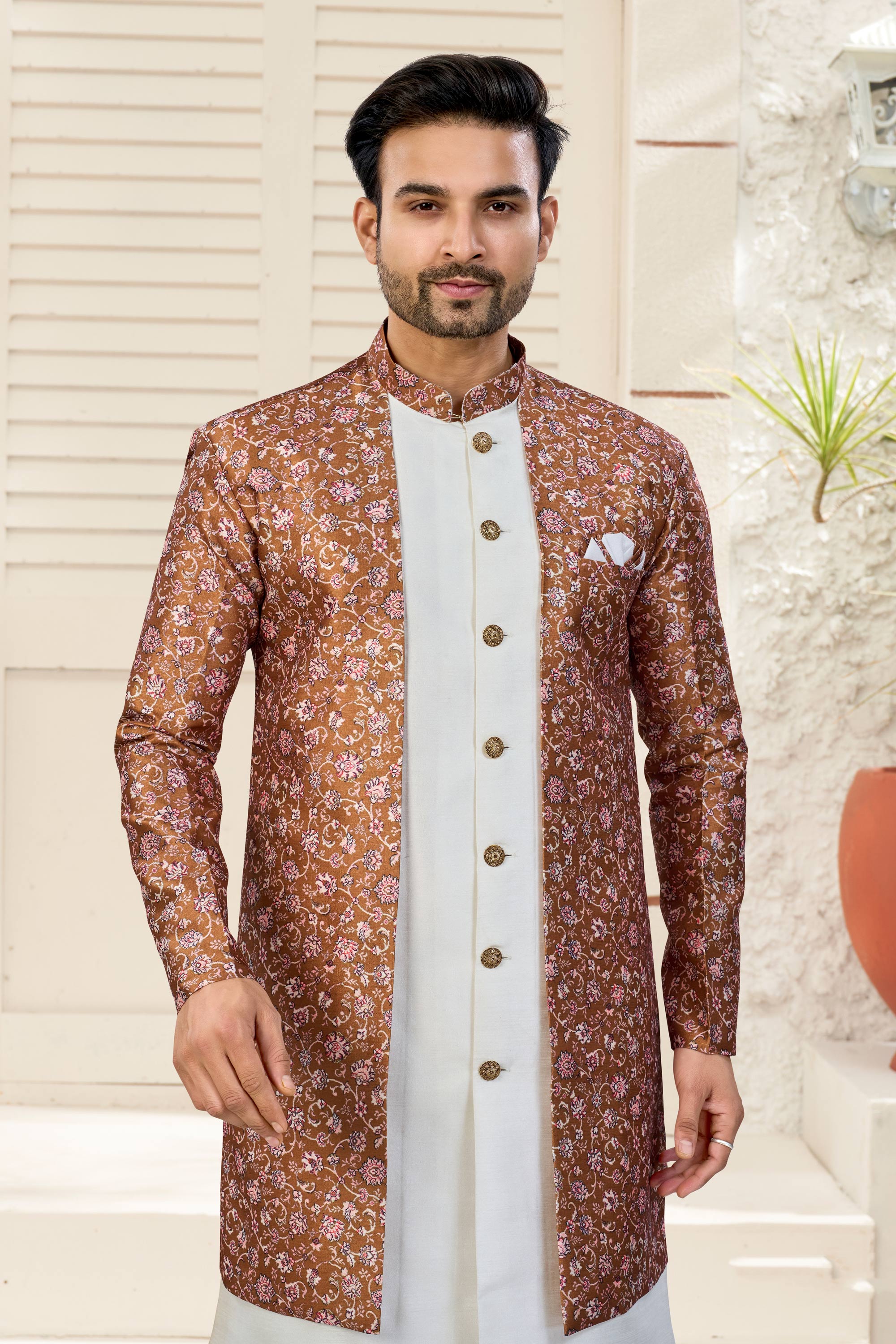 Banarasi Silk Off White Wedding Wear Readymade Indo Western For Men