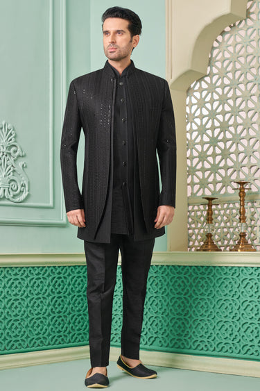 Banarasi Silk Stunning Readymade Nawabi Style Indo Western In Black Color